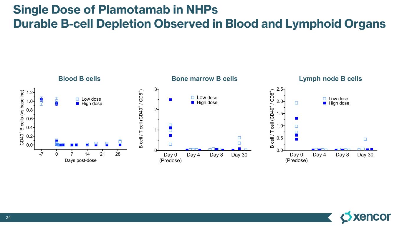 31 0 7 14 21 28 0 20 40 60 80 100 5000 10000 Days post administration B c el ls /μ L of b lo od Single Dose of XmAb657 in NHPs Deep B-cell Depletion Sustained for at Least 28 Days XmAb 657 Single IV Dose (low) XmAb657 Single IV Dose (high) * * * * * * * *** Peripheral blood 0 7 14 21 28 0 20 40 60 80 100 5000 10000 Days post administration B c el ls /μ L of b lo od 0 7 14 21 28 0 1 2 3 4 Days post administration % B c el ls a m on g ly m ph no de le uk oc yt es 0 7 14 21 28 0 1 2 3 4 5 Days post administration % B c el ls a m on g ly m ph no de le uk oc yt es 0 7 14 21 28 0 1 2 3 Days post administration % B c el ls a m on g bo ne m ar ro w le uk oc yt es Bone marrow Lymph nodes 0 7 14 21 28 0.0 0.5 1.0 1.5 2.0 Days post administration % B c el ls a m on g bo ne m ar ro w le uk oc yt es *peripheral B cells <1 B cell per µL; ‡this data point is zero B cells per µL ‡‡ ‡ B cells were gated as CD45+CD2-/lowCD20+CD4-CD8a-CD159a-
