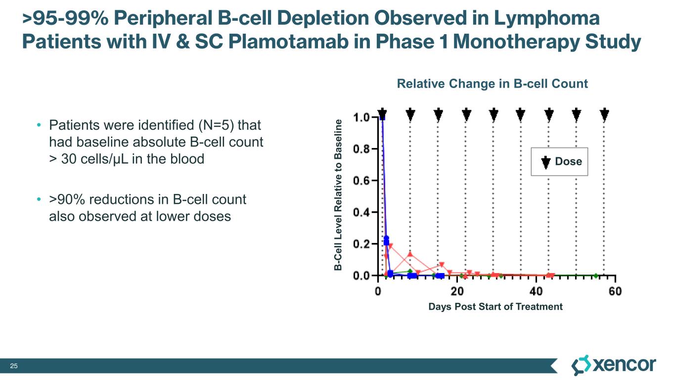 24 Day 0 (Predose) Day 4 Day 8 Day 30 0 1 2 3 B ce ll / T c el l ( C D 40 + / C D 8+ ) Low dose High dose Single Dose of Plamotamab in NHPs Durable B-cell Depletion Observed in Blood and Lymphoid Organs Blood B cells Lymph node B cellsBone marrow B cells Days post-dose C D 40 + B c el ls (v s ba se lin e) -7 0 7 14 21 28 0.0 0.2 0.4 0.6 0.8 1.0 1.2 Low dose High dose Day 0 (Predose) Day 4 Day 8 Day 30 0.0 0.5 1.0 1.5 2.0 2.5 B ce ll / T c el l ( C D 40 + / C D 8+ ) Low dose High dose