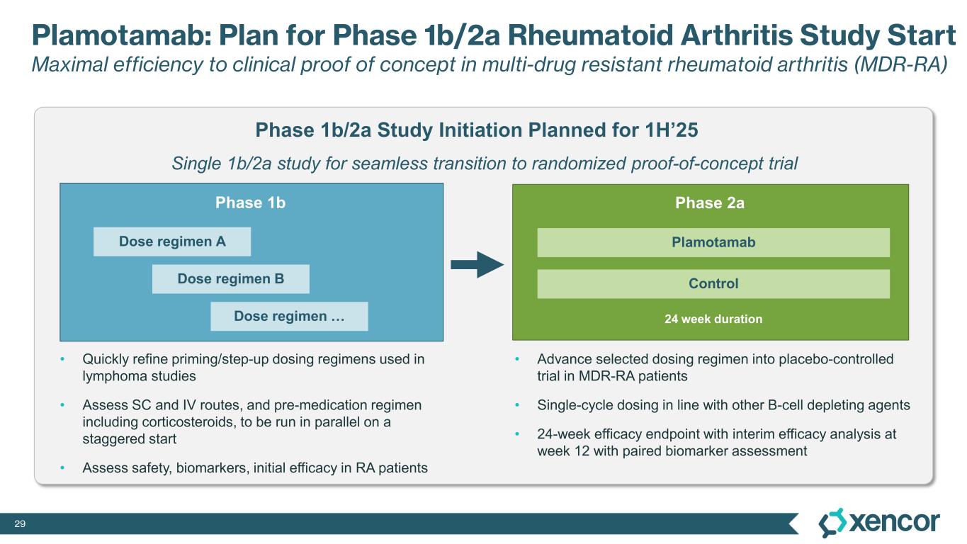 28 No Grade 3 CRS and Lower Grade CRS Observed, Compared to Commercial CD20 x CD31 Epcoritamab SC CRS2Plamotamab SC CRS Pooled cohorts 1 No head-to-head clinical trial has been conducted evaluating plamotamab against epcoritamab. Differences exist between trial design and patient populations, and caution should be exercised when comparing data across unrelated trials. 2 Epcoritamab, a Novel, Subcutaneous CD3xCD20 Bispecific T-Cell–Engaging Antibody, in Relapsed or Refractory Large B-Cell Lymphoma: Dose Expansion in a Phase I/II Trial; Thieblemont and Lugtenburg et al.; J Clin Oncol 41:2238-2247. Data cutoff: January 31, 2022. 5 (25%) 1 (5%) 4 (22%) 1 (6%) 1 (8%) 2 (10%) 1 (5%) 0% 20% 40% 60% 80% 100% C1D1 n=20 C1D8 n=19 C1D15 n=18 C1D22 n=16 C2D1 n=13 C2D8 n=12 C2D15 n=13 C2D22 n=10 Pe rc en ta ge o f P at ie nt s w ith C R S Grade 2 Grade 1 4.5% 9.8% 27.2% 3.5% 1.5% 1.3% 2.0% 12.9% 1.4% 1.5% 2.7% 0.0% 20.0% 40.0% 60.0% 80.0% 100.0% Priming C1D1 0.16 mg n=157 Intermediate C1D8 0.8 mg n=153 First full C1D15 48 mg n=147 Second full C1D22 48 mg n=144 Third full+ C2D1+ 48 mg n=136 Pe rc en ta ge o f P at ie nt s w ith C R S Grade 3 Grade 2 Grade 1 No Grade 3 CRS Similar results across dose levels Summary of CRS at Recommended IV Dose regimen: < 50% incidence overall, no Grade 3, Cycle 1 limited