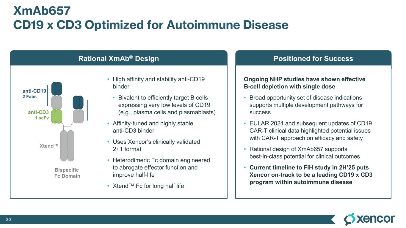 30 Positioned for SuccessRational XmAb® Design XmAb657 CD19 x CD3 Optimized for Autoimmune Disease Bispecific Fc Domain Ongoing NHP studies have shown effective B-cell depletion with single dose • Broad opportunity set of disease indications supports multiple development pathways for success • EULAR 2024 and subsequent updates of CD19 CAR-T clinical data highlighted potential issues with CAR-T approach on efficacy and safety • Rational design of XmAb657 supports best-in-class potential for clinical outcomes • Current timeline to FIH study in 2H’25 puts Xencor on-track to be a leading CD19 x CD3 program within autoimmune disease • High affinity and stability anti-CD19 binder • Bivalent to efficiently target B cells expressing very low levels of CD19 (e.g., plasma cells and plasmablasts) • Affinity-tuned and highly stable anti-CD3 binder • Uses Xencor’s clinically validated 2+1 format • Heterodimeric Fc domain engineered to abrogate effector function and improve half-life • Xtend Fc for long half life anti-CD3 1 scFv anti-CD19 2 Fabs Xtend