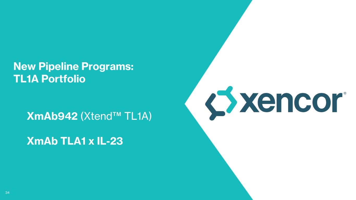 33 XmAb657: Rationally Designed for Autoimmune Disease FIH Planned 2H’25 • Has been observed to demonstrate deep and durable B-cell depletion in NHPs, enabled by potentially best-in-class pharmacokinetics • Has been well tolerated in NHP with no clinical signs of CRS • GMP production campaign initiated • Further plans to investigate subcutaneous dosing and priming • First-in-human study planned to initiate in 2H’25 0 7 14 21 28 Time (Days post dose) Xm A b6 57 s er um c on c. [n g/ m L] , l og s ca le Long half life with Xtend Fc technology (~15 days in NHP) has potential for durable B-cell depletion 0 7 14 21 28 0 20 40 60 80 100 5000 10000 Days post administration B c el ls /μ L of b lo od 0 7 14 21 28 0.0 0.5 1.0 1.5 2.0 Days post administration % B c el ls a m on g bo ne m ar ro w le uk oc yt es Peripheral B cells Lymph node B cells