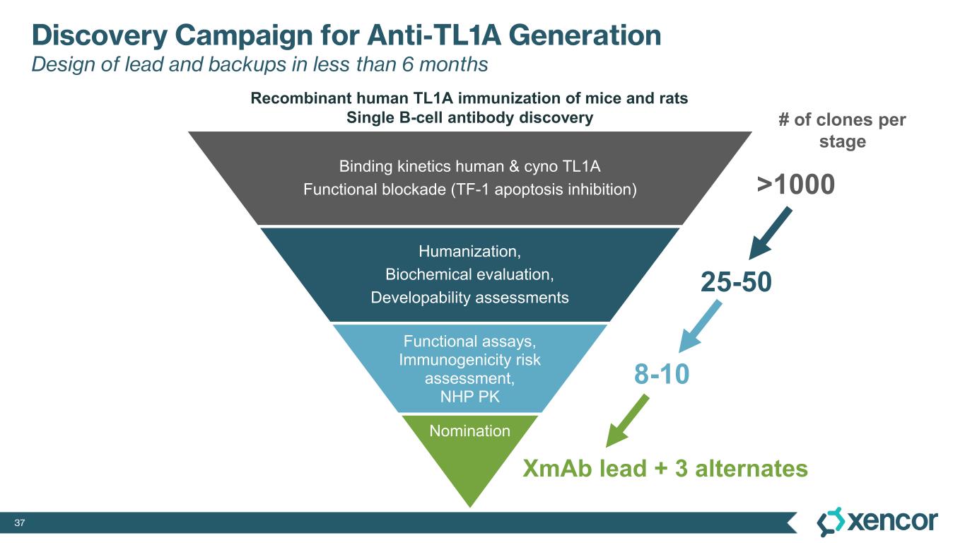 37 Binding kinetics human & cyno TL1A Functional blockade (TF-1 apoptosis inhibition) Humanization, Biochemical evaluation, Developability assessments Functional assays, Immunogenicity risk assessment, NHP PK Nomination 25-50 8-10 XmAb lead + 3 alternates >1000 # of clones per stage Discovery Campaign for Anti-TL1A Generation Design of lead and backups in less than 6 months Recombinant human TL1A immunization of mice and rats Single B-cell antibody discovery