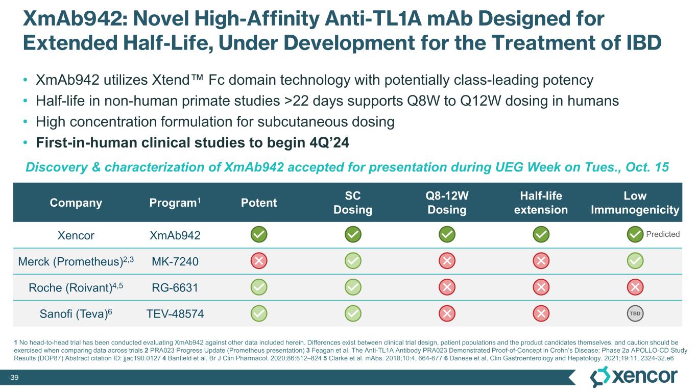 39 XmAb942: Novel High-Affinity Anti-TL1A mAb Designed for Extended Half-Life, Under Development for the Treatment of IBD • XmAb942 utilizes Xtend Fc domain technology with potentially class-leading potency • Half-life in non-human primate studies >22 days supports Q8W to Q12W dosing in humans • High concentration formulation for subcutaneous dosing • First-in-human clinical studies to begin 4Q’24 Company Program1 Potent SC Dosing Q8-12W Dosing Half-life extension Low Immunogenicity Xencor XmAb942 Merck (Prometheus)2,3 MK-7240 Roche (Roivant)4,5 RG-6631 Sanofi (Teva)6 TEV-48574 TBD Predicted Discovery & characterization of XmAb942 accepted for presentation during UEG Week on Tues., Oct. 15 1 No head-to-head trial has been conducted evaluating XmAb942 against other data included herein. Differences exist between clinical trial design, patient populations and the product candidates themselves, and caution should be exercised when comparing data across trials 2 PRA023 Progress Update (Prometheus presentation) 3 Feagan et al. The Anti-TL1A Antibody PRA023 Demonstrated Proof-of-Concept in Crohn’s Disease: Phase 2a APOLLO-CD Study Results (DOP87) Abstract citation ID: jjac190.0127 4 Banfield et al. Br J Clin Pharmacol. 2020;86:812–824 5 Clarke et al. mAbs. 2018;10:4, 664-677 6 Danese et al. Clin Gastroenterology and Hepatology. 2021;19:11, 2324-32.e6