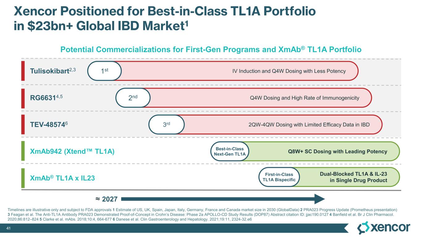 40 XmAb® TL1A x IL-23 to Have First-in-Class Potential First-in-Human Study Planned in 2026 TL1A Activity 0.0 01 0.0 1 0.1 1 10 10 0 1 2 3 4 Concentration (nM) Fo ld in du ct io n IL-23 Activity • Rapidly prototype in multiple formats • Optimize and tune for biological activity IL-23 Ab Control TL1A Ab Control TL1A x IL-23 Prototype 2 TL1A x IL-23 Prototype 1 0.0 01 0.0 1 0.1 1 10 10 0 0 5×103 1×104 1.5×10 4 2×104 2.5×10 4 Concentration (nM) R LU XmAb protein engineering allows for a range of stable molecular structures Prototype TL1A x IL-23p19 bispecifics are functionally active on both axes