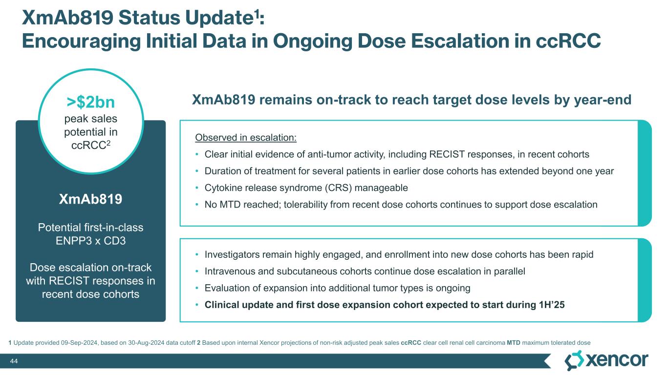 43 XmAb® T-Cell Engager Programs Designed to Address Unmet Need with Potential Across Multiple Tumor Types XmAb819 (ENPP3 x CD3) • Engineered for greater selectivity for ENPP3- expressing tumor cells compared to normal cells, which also express ENPP3 at lower levels • In development for patients with relapsed/ refractory clear cell RCC (ccRCC), which has nearly uniformly high ENPP3 expression • Dose-escalation ongoing XmAb541 (CLDN6 x CD3) • Engineered for CLDN6 selectivity over similar CLDN9, CLDN3 and CLDN4 • In development for patients with CLDN6+ tumors, including ovarian cancer • Dose-escalation ongoing XmAb808 (B7-H3 x CD28) • Engineered to provide tumor-selective co-stimulation only when bound to tumor cells • Combination with anti-PD1 (pembrolizumab) • In development for patients with solid tumors • Dose-escalation ongoing anti-CD3 1 scFv anti-ENPP3 2 Fabs Bispecific Fc Domain anti-CD3 1 scFv anti-CLDN6 2 Fabs Xtend anti-CD28 1 Fab anti-B7-H3 2 Fabs XtendBispecific Fc Domain Bispecific Fc Domain