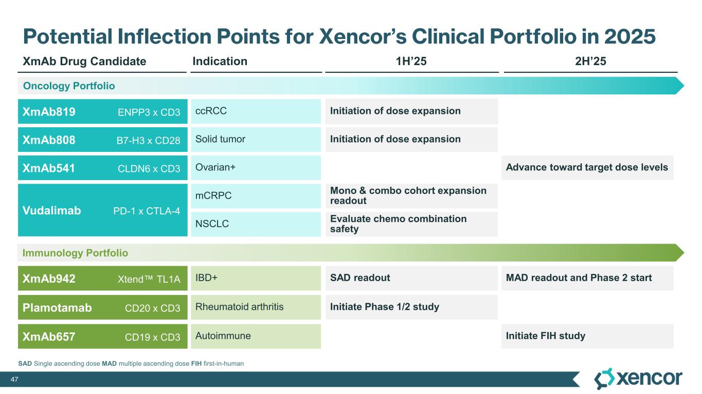 47 Potential Inflection Points for Xencor’s Clinical Portfolio in 2025 XmAb Drug Candidate Indication Oncology Portfolio Vudalimab PD-1 x CTLA-4 mCRPC NSCLC XmAb819 ENPP3 x CD3 ccRCC Initiation of dose expansion XmAb808 B7-H3 x CD28 Solid tumor Initiation of dose expansion Ovarian+XmAb541 CLDN6 x CD3 Advance toward target dose levels Mono & combo cohort expansion readout Evaluate chemo combination safety XmAb942 Xtend TL1A IBD+ SAD readout MAD readout and Phase 2 start Plamotamab CD20 x CD3 Rheumatoid arthritis Initiate Phase 1/2 study XmAb657 CD19 x CD3 Autoimmune Initiate FIH study 1H’25 2H’25 Immunology Portfolio SAD Single ascending dose MAD multiple ascending dose FIH first-in-human
