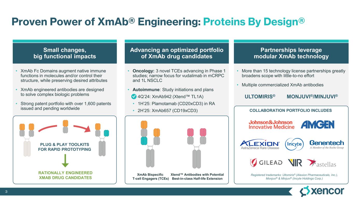 2 Forward-Looking Statements Certain statements contained in this presentation, other than statements of historical fact, may constitute forward- looking statements within the meaning of the Private Securities Litigation Reform Act of 1995. Such statements include, but are not limited to, statements regarding Xencor's development plans and timelines; potential regulatory actions; expected use of cash resources; the timing and results of clinical trials; the plans and objectives of management for future operations; and the potential markets for Xencor's product and development candidates. Forward-looking statements are based on the current expectations of management and upon what management believes to be reasonable assumptions based on information currently available to it, and involve numerous risks and uncertainties, many of which are beyond Xencor's control. These risks and uncertainties could cause future results, performance or achievements to differ significantly from the results, performance or achievements expressed or implied by such forward-looking statements. Such risks include, but are not limited to, potential delays in development timelines or negative preclinical or clinical trial results, reliance on third parties for development efforts and changes in the competitive landscape including changes in the standard of care, as well as other risks described in Xencor's filings with the Securities and Exchange Commission (SEC). Xencor expressly disclaims any duty, obligation or undertaking to update or revise any forward-looking statements contained herein to reflect any change in Xencor's expectations with regard thereto of any subsequent change in events, conditions or circumstances on which any such statements are based, except in accordance with applicable securities laws. For all forward-looking statements, we claim the protection of the safe harbor for forward looking statements contained in the Private Securities Litigation Reform Act of 1995.