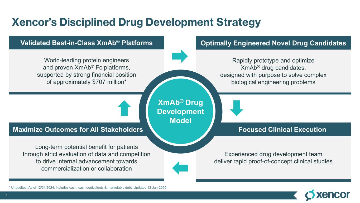 3 • XmAb Fc Domains augment native immune functions in molecules and/or control their structure, while preserving desired attributes • XmAb engineered antibodies are designed to solve complex biologic problems • Strong patent portfolio with over 1,600 patents issued and pending worldwide • Oncology: 3 novel TCEs advancing in Phase 1 studies; narrow focus for vudalimab in mCRPC and 1L NSCLC • Autoimmune: Study initiations and plans • 4Q’24: XmAb942 (Xtend TL1A) • 1H’25: Plamotamab (CD20xCD3) in RA • 2H’25: XmAb657 (CD19xCD3) • More than 15 technology license partnerships greatly broadens scope with little-to-no effort • Multiple commercialized XmAb antibodies ULTOMIRIS® MONJUVI®/MINJUVI® Proven Power of XmAb® Engineering: Proteins By Design® AstraZeneca Rare Disease Small changes, big functional impacts Advancing an optimized portfolio of XmAb drug candidates Partnerships leverage modular XmAb technology Registered trademarks: Ultomiris® (Alexion Pharmaceuticals, Inc.), Monjuvi® & Minjuvi® (Incyte Holdings Corp.) COLLABORATION PORTFOLIO INCLUDES XmAb Bispecific T-cell Engagers (TCEs) Xtend Antibodies with Potential Best-in-class Half-life Extension PLUG & PLAY TOOLKITS FOR RAPID PROTOTYPING RATIONALLY ENGINEERED XMAB DRUG CANDIDATES 