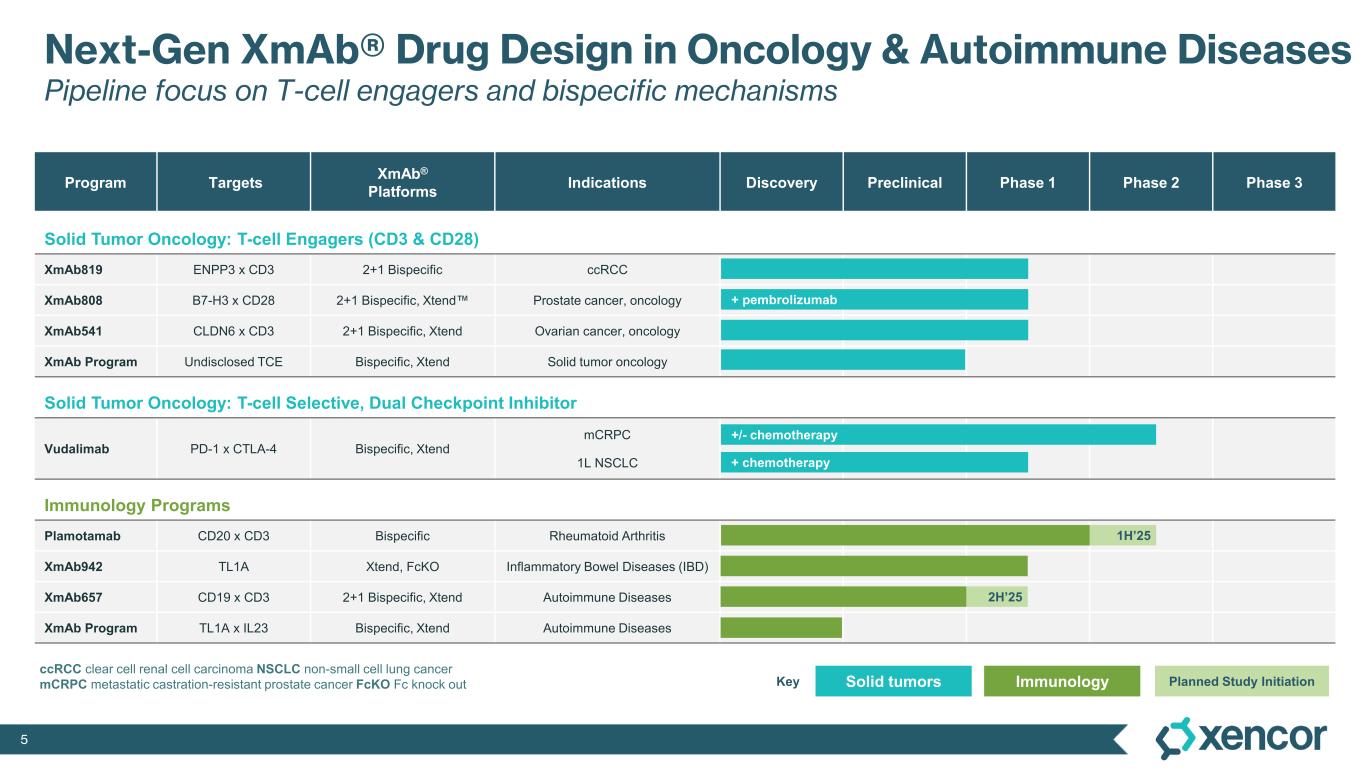 4 World-leading protein engineers and proven XmAb® Fc platforms, supported by strong financial position of approximately $707 million* Experienced drug development team deliver rapid proof-of-concept clinical studies Rapidly prototype and optimize XmAb® drug candidates, designed with purpose to solve complex biological engineering problems Long-term potential benefit for patients through strict evaluation of data and competition to drive internal advancement towards commercialization or collaboration Xencor’s Disciplined Drug Development Strategy Validated Best-in-Class XmAb® Platforms Optimally Engineered Novel Drug Candidates Maximize Outcomes for All Stakeholders Focused Clinical Execution XmAb® Drug Development Model * Unaudited. As of 12/31/2024. Includes cash, cash equivalents & marketable debt. Updated 13-Jan-2025.