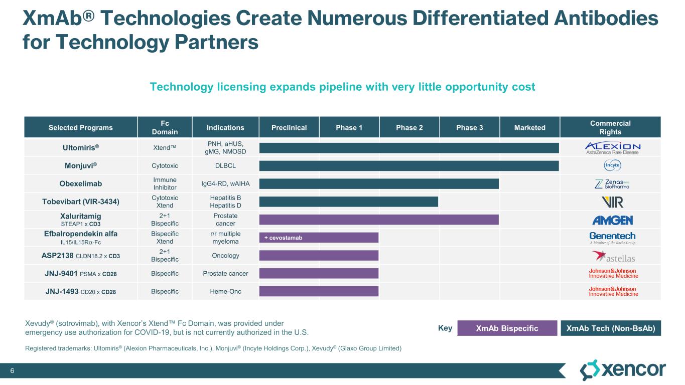 5 Program Targets XmAb® Platforms Indications Discovery Preclinical Phase 1 Phase 2 Phase 3 Solid Tumor Oncology: T-cell Engagers (CD3 & CD28) XmAb819 ENPP3 x CD3 2+1 Bispecific ccRCC XmAb808 B7-H3 x CD28 2+1 Bispecific, Xtend Prostate cancer, oncology XmAb541 CLDN6 x CD3 2+1 Bispecific, Xtend Ovarian cancer, oncology XmAb Program Undisclosed TCE Bispecific, Xtend Solid tumor oncology Solid Tumor Oncology: T-cell Selective, Dual Checkpoint Inhibitor Vudalimab PD-1 x CTLA-4 Bispecific, Xtend mCRPC 1L NSCLC Immunology Programs Plamotamab CD20 x CD3 Bispecific Rheumatoid Arthritis XmAb942 TL1A Xtend, FcKO Inflammatory Bowel Diseases (IBD) XmAb657 CD19 x CD3 2+1 Bispecific, Xtend Autoimmune Diseases XmAb Program TL1A x IL23 Bispecific, Xtend Autoimmune Diseases + chemotherapy Solid tumors Immunology + pembrolizumab +/- chemotherapy Key ccRCC clear cell renal cell carcinoma NSCLC non-small cell lung cancer mCRPC metastatic castration-resistant prostate cancer FcKO Fc knock out 1H’25 2H’25 Planned Study Initiation Next-Gen XmAb® Drug Design in Oncology & Autoimmune Diseases Pipeline focus on T-cell engagers and bispecific mechanisms