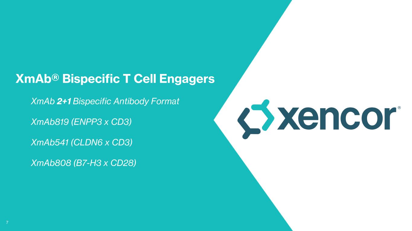 6 XmAb® Technologies Create Numerous Differentiated Antibodies for Technology Partners Selected Programs Fc Domain Indications Preclinical Phase 1 Phase 2 Phase 3 Marketed Commercial Rights Ultomiris® Xtend PNH, aHUS, gMG, NMOSD Monjuvi® Cytotoxic DLBCL Obexelimab Immune Inhibitor IgG4-RD, wAIHA Tobevibart (VIR-3434) Cytotoxic Xtend Hepatitis B Hepatitis D Xaluritamig STEAP1 x CD3 2+1 Bispecific Prostate cancer Efbalropendekin alfa IL15/IL15Rα-Fc Bispecific Xtend r/r multiple myeloma ASP2138 CLDN18.2 x CD3 2+1 Bispecific Oncology JNJ-9401 PSMA x CD28 Bispecific Prostate cancer JNJ-1493 CD20 x CD28 Bispecific Heme-Onc Technology licensing expands pipeline with very little opportunity cost AstraZeneca Rare Disease + cevostamab XmAb BispecificKey XmAb Tech (Non-BsAb)Xevudy® (sotrovimab), with Xencor’s Xtend Fc Domain, was provided under emergency use authorization for COVID-19, but is not currently authorized in the U.S. Registered trademarks: Ultomiris® (Alexion Pharmaceuticals, Inc.), Monjuvi® (Incyte Holdings Corp.), Xevudy® (Glaxo Group Limited)