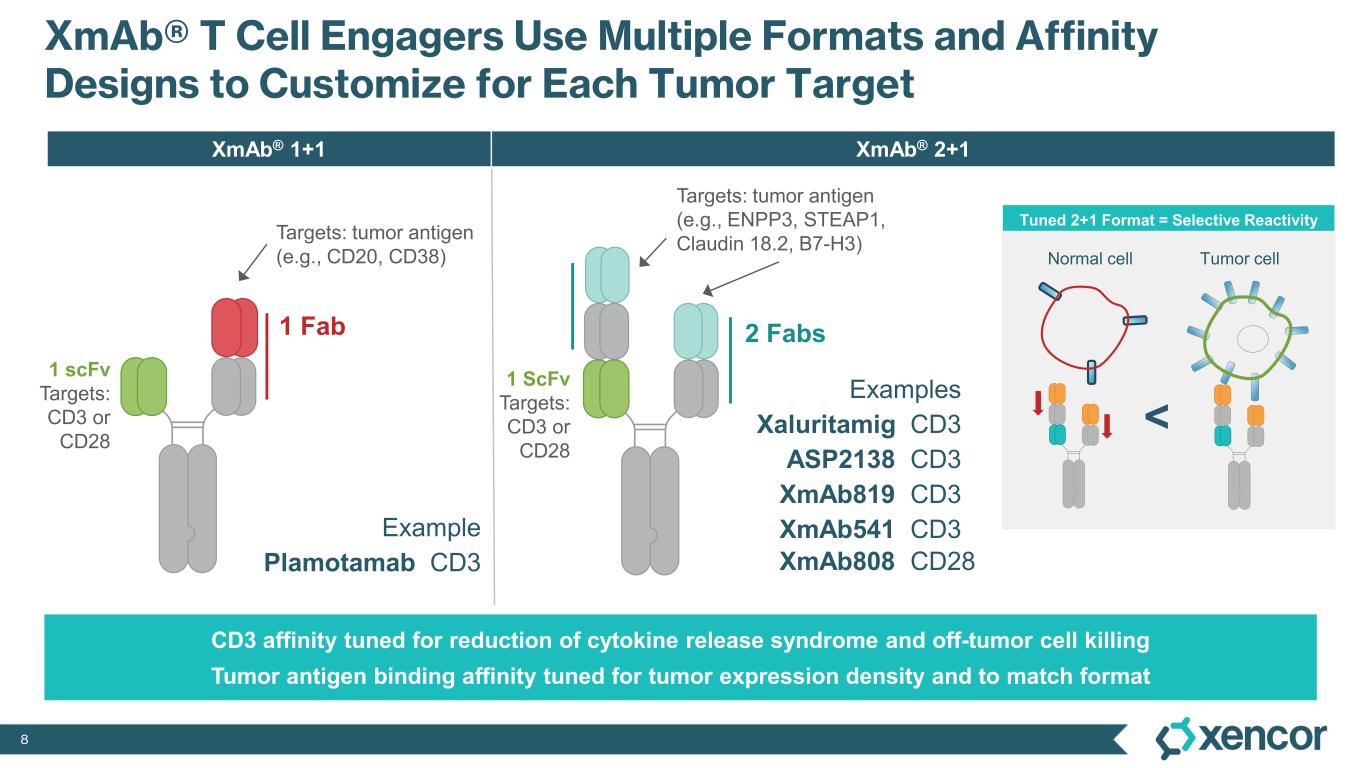 7 ® XmAb® Bispecific T Cell Engagers XmAb 2+1 Bispecific Antibody Format XmAb819 (ENPP3 x CD3) XmAb541 (CLDN6 x CD3) XmAb808 (B7-H3 x CD28)