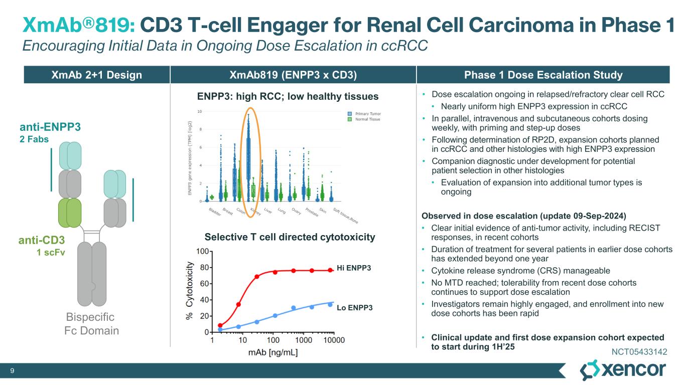 8 XmAb® T Cell Engagers Use Multiple Formats and Affinity Designs to Customize for Each Tumor Target 1 ScFv Targets: CD3 or CD28 Targets: tumor antigen (e.g., ENPP3, STEAP1, Claudin 18.2, B7-H3)Targets: tumor antigen (e.g., CD20, CD38) Examples Xaluritamig CD3 ASP2138 CD3 XmAb819 CD3 XmAb541 CD3 CD3 affinity tuned for reduction of cytokine release syndrome and off-tumor cell killing Tumor antigen binding affinity tuned for tumor expression density and to match format Example Plamotamab CD3 1 scFv Targets: CD3 or CD28 1 Fab 2 Fabs XmAb808 CD28 XmAb® 2+1XmAb® 1+1 Tuned 2+1 Format = Selective Reactivity < Tumor cellNormal cell