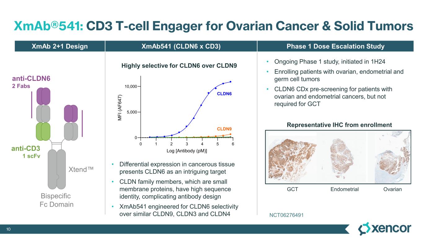 9 XmAb®819: CD3 T-cell Engager for Renal Cell Carcinoma in Phase 1 Encouraging Initial Data in Ongoing Dose Escalation in ccRCC XmAb819 (ENPP3 x CD3) Phase 1 Dose Escalation Study Selective T cell directed cytotoxicity Hi ENPP3 Lo ENPP3 XmAb 2+1 Design ENPP3: high RCC; low healthy tissues • Dose escalation ongoing in relapsed/refractory clear cell RCC • Nearly uniform high ENPP3 expression in ccRCC • In parallel, intravenous and subcutaneous cohorts dosing weekly, with priming and step-up doses • Following determination of RP2D, expansion cohorts planned in ccRCC and other histologies with high ENPP3 expression • Companion diagnostic under development for potential patient selection in other histologies • Evaluation of expansion into additional tumor types is ongoing Observed in dose escalation (update 09-Sep-2024) • Clear initial evidence of anti-tumor activity, including RECIST responses, in recent cohorts • Duration of treatment for several patients in earlier dose cohorts has extended beyond one year • Cytokine release syndrome (CRS) manageable • No MTD reached; tolerability from recent dose cohorts continues to support dose escalation • Investigators remain highly engaged, and enrollment into new dose cohorts has been rapid • Clinical update and first dose expansion cohort expected to start during 1H’25 Bispecific Fc Domain anti-ENPP3 2 Fabs NCT05433142 anti-CD3 1 scFv