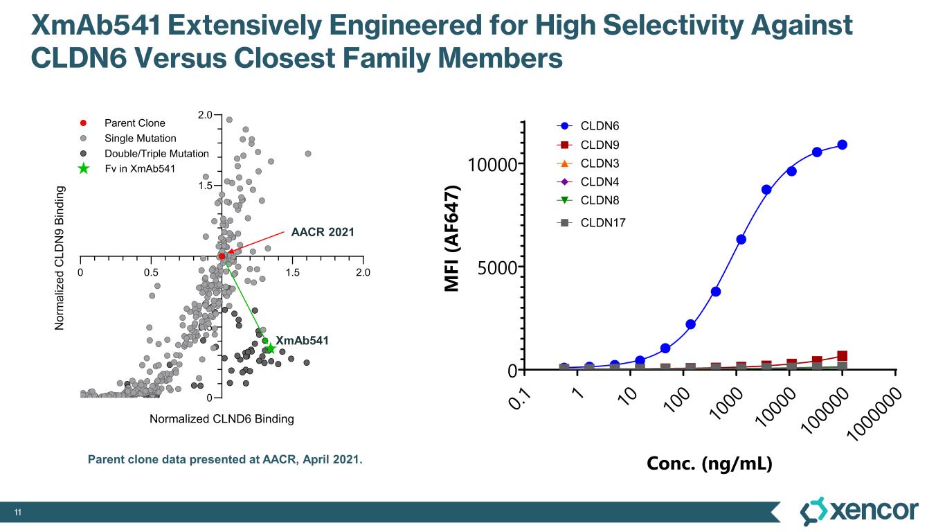 10 XmAb®541: CD3 T-cell Engager for Ovarian Cancer & Solid Tumors XmAb541 (CLDN6 x CD3) Phase 1 Dose Escalation StudyXmAb 2+1 Design Highly selective for CLDN6 over CLDN9 • Differential expression in cancerous tissue presents CLDN6 as an intriguing target • CLDN family members, which are small membrane proteins, have high sequence identity, complicating antibody design • XmAb541 engineered for CLDN6 selectivity over similar CLDN9, CLDN3 and CLDN4 anti-CD3 1 scFv Bispecific Fc Domain anti-CLDN6 2 Fabs NCT06276491 Xtend 0 1 2 3 4 5 6 0 5,000 10,000 Log [Antibody (pM)] M FI (A F6 47 ) GCT Endometrial Ovarian Representative IHC from enrollment • Ongoing Phase 1 study, initiated in 1H24 • Enrolling patients with ovarian, endometrial and germ cell tumors • CLDN6 CDx pre-screening for patients with ovarian and endometrial cancers, but not required for GCT CLDN6 CLDN9