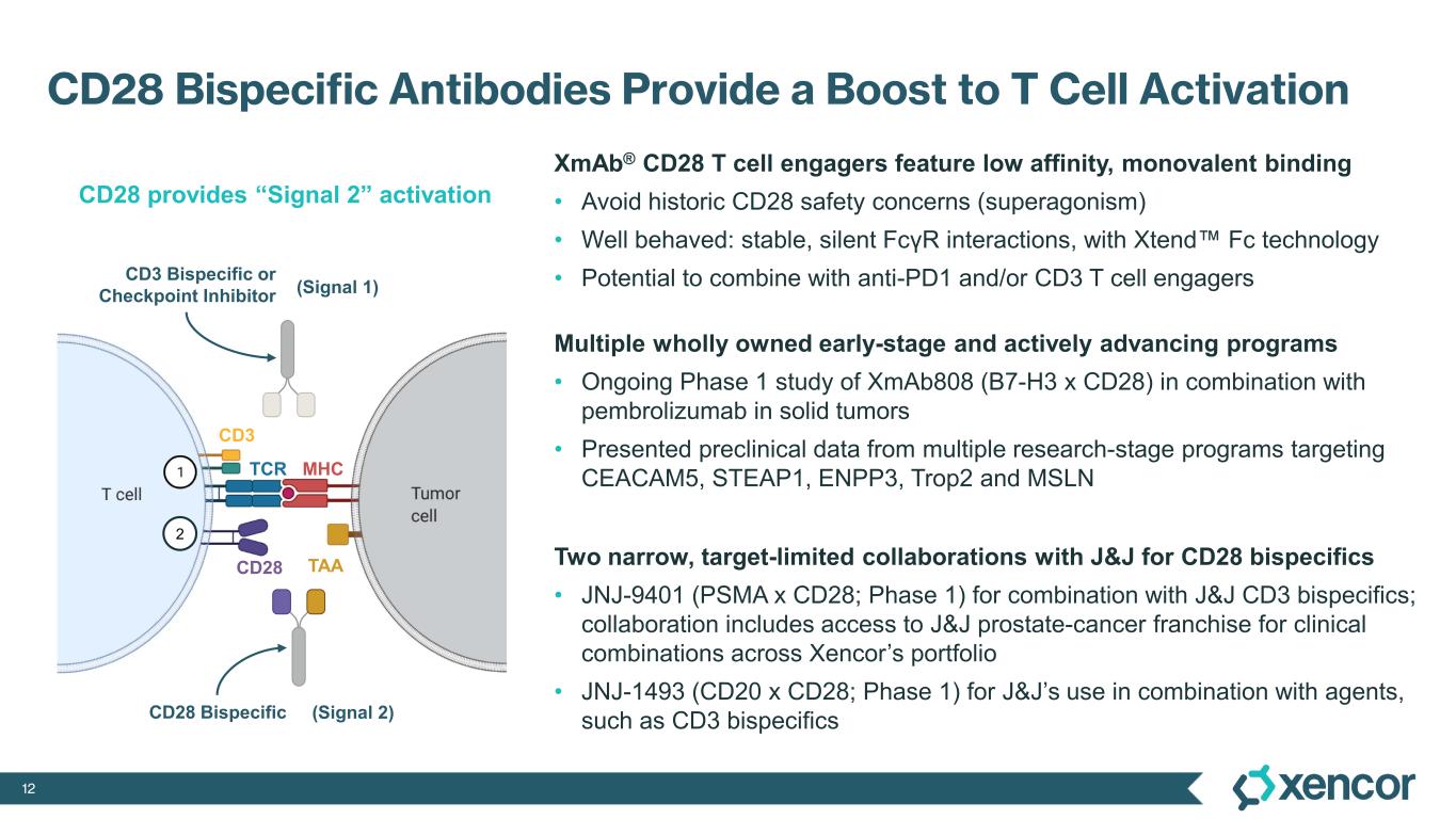 11 XmAb541 Extensively Engineered for High Selectivity Against CLDN6 Versus Closest Family Members 0.1 1 10 10 0 10 00 10 00 0 10 00 00 10 00 00 0 0 5000 10000 Conc. (ng/mL) M FI (A F6 47 ) CLDN17 CLDN8 CLDN4 CLDN3 CLDN9 CLDN6 0.5 1.5 2.0 0.5 1.5 2.0 Normalized CLND6 Binding N or m al iz ed C LD N 9 Bi nd in g Single Mutation Double/Triple Mutation Parent Clone 0 0 Fv in XmAb541 AACR 2021 XmAb541 Parent clone data presented at AACR, April 2021.