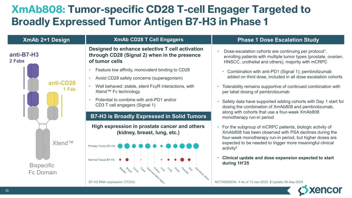 12 CD28 Bispecific Antibodies Provide a Boost to T Cell Activation XmAb® CD28 T cell engagers feature low affinity, monovalent binding • Avoid historic CD28 safety concerns (superagonism) • Well behaved: stable, silent FcγR interactions, with Xtend Fc technology • Potential to combine with anti-PD1 and/or CD3 T cell engagers Multiple wholly owned early-stage and actively advancing programs • Ongoing Phase 1 study of XmAb808 (B7-H3 x CD28) in combination with pembrolizumab in solid tumors • Presented preclinical data from multiple research-stage programs targeting CEACAM5, STEAP1, ENPP3, Trop2 and MSLN Two narrow, target-limited collaborations with J&J for CD28 bispecifics • JNJ-9401 (PSMA x CD28; Phase 1) for combination with J&J CD3 bispecifics; collaboration includes access to J&J prostate-cancer franchise for clinical combinations across Xencor’s portfolio • JNJ-1493 (CD20 x CD28; Phase 1) for J&J’s use in combination with agents, such as CD3 bispecifics CD28 provides “Signal 2” activation (Signal 1) (Signal 2) TAA 2 CD3 Bispecific or Checkpoint Inhibitor CD28 CD3 TCR MHC CD28 Bispecific