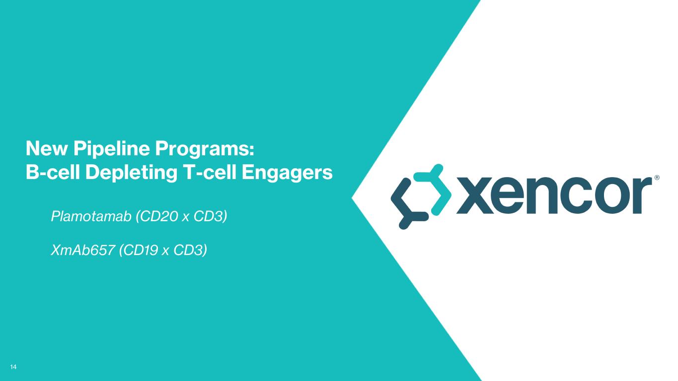13 XmAb808: Tumor-specific CD28 T-cell Engager Targeted to Broadly Expressed Tumor Antigen B7-H3 in Phase 1 Phase 1 Dose Escalation Study • Dose-escalation cohorts are continuing per protocol1, enrolling patients with multiple tumor types (prostate, ovarian, HNSCC, urothelial and others), majority with mCRPC • Combination with anti-PD1 (Signal 1); pembrolizumab added on third dose, included in all dose escalation cohorts • Tolerability remains supportive of continued combination with per label dosing of pembrolizumab • Safety data have supported adding cohorts with Day 1 start for dosing the combination of XmAb808 and pembrolizumab, along with cohorts that use a four-week XmAb808 monotherapy run-in period • For the subgroup of mCRPC patients, biologic activity of XmAb808 has been observed with PSA declines during the four-week monotherapy run-in period, but higher doses are expected to be needed to trigger more meaningful clinical activity2 • Clinical update and dose expansion expected to start during 1H’25 XmAb 2+1 Design B7-H3 is Broadly Expressed in Solid Tumors High expression in prostate cancer and others (kidney, breast, lung, etc.) XmAb CD28 T Cell Engagers B7-H3 RNA expression (TCGA) Primary Tumor B7-H3 Normal Tissue B7-H3 NCT05585034. 1 As of 13-Jan-2025 2 Update 09-Sep-2024 Designed to enhance selective T cell activation through CD28 (Signal 2) when in the presence of tumor cells • Feature low affinity, monovalent binding to CD28 • Avoid CD28 safety concerns (superagonism) • Well behaved: stable, silent FcγR interactions, with Xtend Fc technology • Potential to combine with anti-PD1 and/or CD3 T cell engagers (Signal 1) anti-CD28 1 Fab anti-B7-H3 2 Fabs Xtend Bispecific Fc Domain