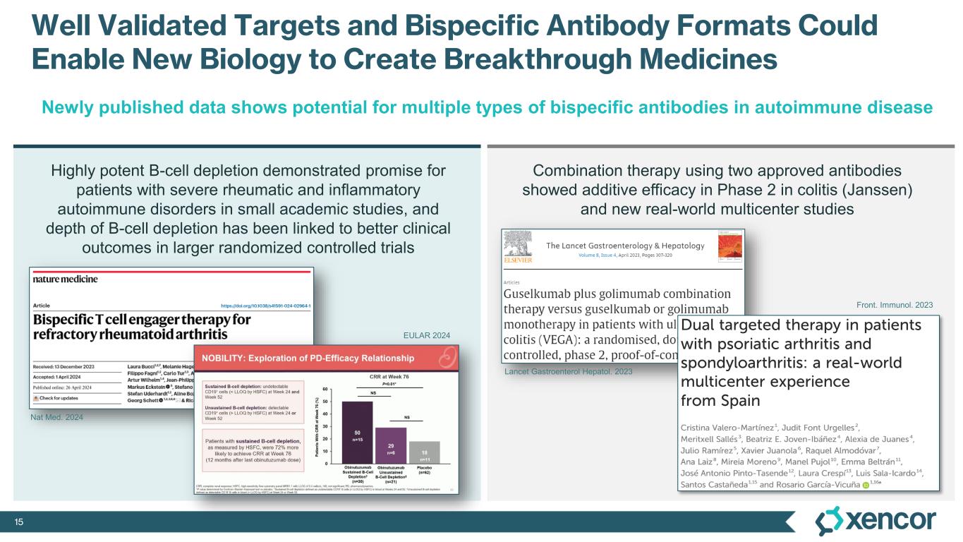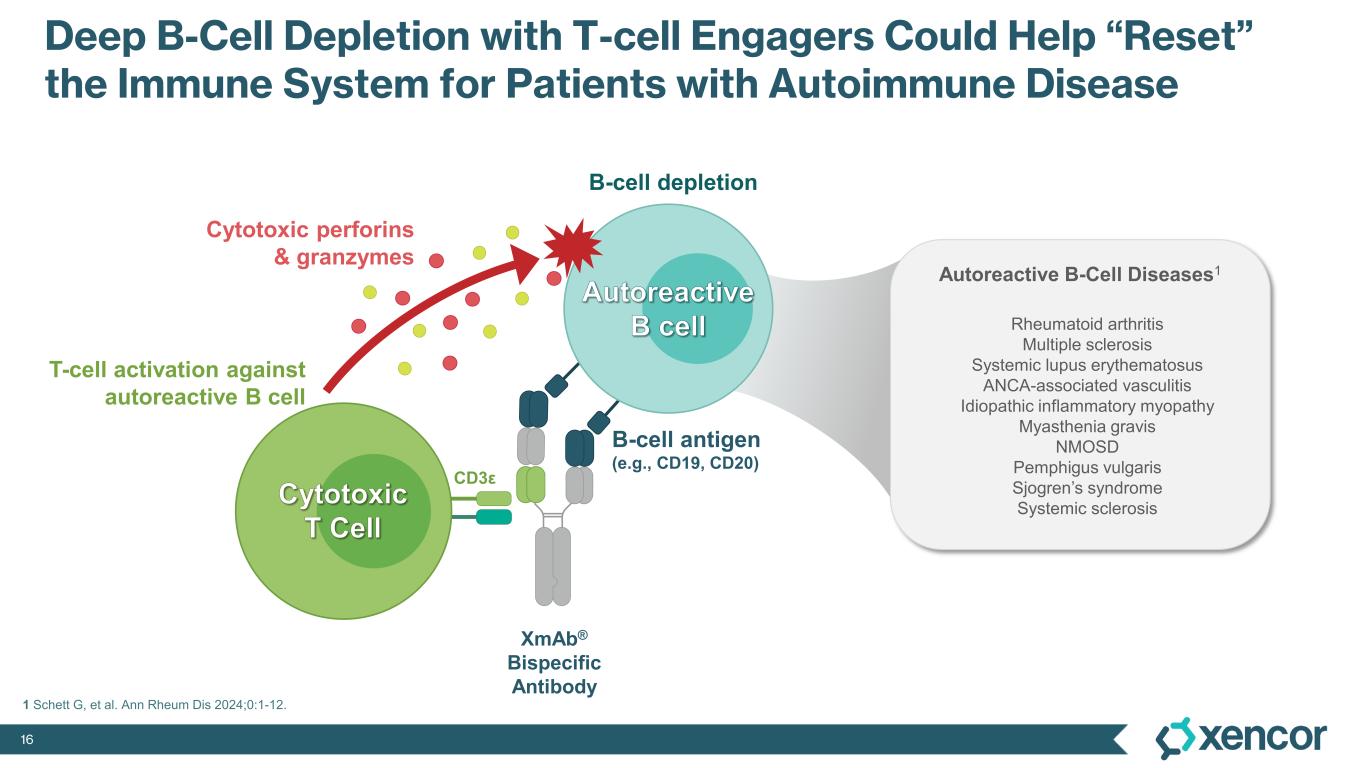 15 Well Validated Targets and Bispecific Antibody Formats Could Enable New Biology to Create Breakthrough Medicines Combination therapy using two approved antibodies showed additive efficacy in Phase 2 in colitis (Janssen) and new real-world multicenter studies Highly potent B-cell depletion demonstrated promise for patients with severe rheumatic and inflammatory autoimmune disorders in small academic studies, and depth of B-cell depletion has been linked to better clinical outcomes in larger randomized controlled trials Newly published data shows potential for multiple types of bispecific antibodies in autoimmune disease Nat Med. 2024 EULAR 2024 Front. Immunol. 2023 Lancet Gastroenterol Hepatol. 2023
