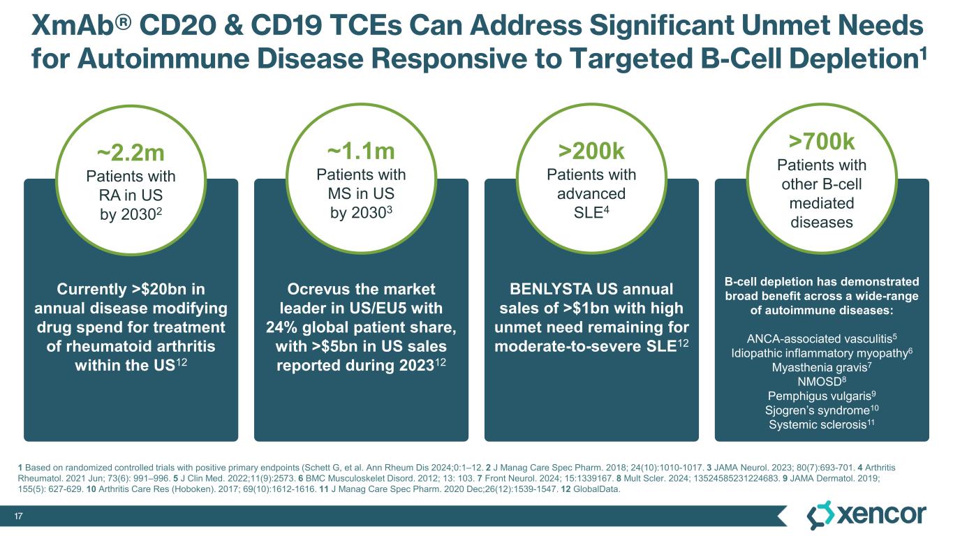 16 Deep B-Cell Depletion with T-cell Engagers Could Help “Reset” the Immune System for Patients with Autoimmune Disease B-cell antigen (e.g., CD19, CD20) B-cell depletion T-cell activation against autoreactive B cell XmAb® Bispecific Antibody Autoreactive B-Cell Diseases1 Cytotoxic perforins & granzymes CD3ε Rheumatoid arthritis Multiple sclerosis Systemic lupus erythematosus ANCA-associated vasculitis Idiopathic inflammatory myopathy Myasthenia gravis NMOSD Pemphigus vulgaris Sjogren’s syndrome Systemic sclerosis 1 Schett G, et al. Ann Rheum Dis 2024;0:1-12.
