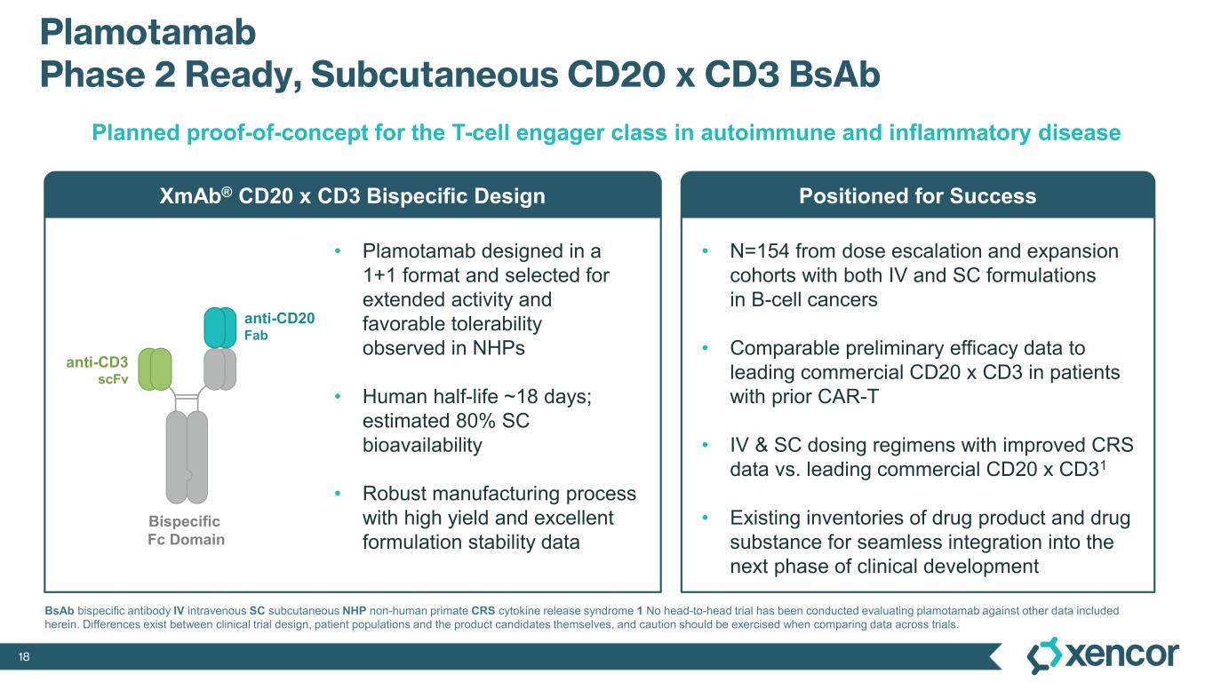 17 XmAb® CD20 & CD19 TCEs Can Address Significant Unmet Needs for Autoimmune Disease Responsive to Targeted B-Cell Depletion1 Currently >$20bn in annual disease modifying drug spend for treatment of rheumatoid arthritis within the US12 Ocrevus the market leader in US/EU5 with 24% global patient share, with >$5bn in US sales reported during 202312 BENLYSTA US annual sales of >$1bn with high unmet need remaining for moderate-to-severe SLE12 B-cell depletion has demonstrated broad benefit across a wide-range of autoimmune diseases: ANCA-associated vasculitis5 Idiopathic inflammatory myopathy6 Myasthenia gravis7 NMOSD8 Pemphigus vulgaris9 Sjogren’s syndrome10 Systemic sclerosis11 ~2.2m Patients with RA in US by 20302 ~1.1m Patients with MS in US by 20303 >200k Patients with advanced SLE4 >700k Patients with other B-cell mediated diseases 1 Based on randomized controlled trials with positive primary endpoints (Schett G, et al. Ann Rheum Dis 2024;0:1–12. 2 J Manag Care Spec Pharm. 2018; 24(10):1010-1017. 3 JAMA Neurol. 2023; 80(7):693-701. 4 Arthritis Rheumatol. 2021 Jun; 73(6): 991–996. 5 J Clin Med. 2022;11(9):2573. 6 BMC Musculoskelet Disord. 2012; 13: 103. 7 Front Neurol. 2024; 15:1339167. 8 Mult Scler. 2024; 13524585231224683. 9 JAMA Dermatol. 2019; 155(5): 627-629. 10 Arthritis Care Res (Hoboken). 2017; 69(10):1612-1616. 11 J Manag Care Spec Pharm. 2020 Dec;26(12):1539-1547. 12 GlobalData.