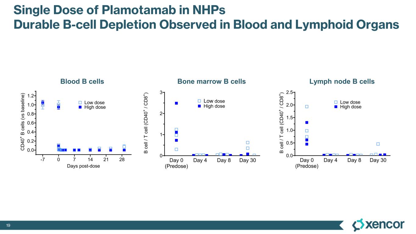 18 Plamotamab Phase 2 Ready, Subcutaneous CD20 x CD3 BsAb Positioned for SuccessXmAb® CD20 x CD3 Bispecific Design • Plamotamab designed in a 1+1 format and selected for extended activity and favorable tolerability observed in NHPs • Human half-life ~18 days; estimated 80% SC bioavailability • Robust manufacturing process with high yield and excellent formulation stability data • N=154 from dose escalation and expansion cohorts with both IV and SC formulations in B-cell cancers • Comparable preliminary efficacy data to leading commercial CD20 x CD3 in patients with prior CAR-T • IV & SC dosing regimens with improved CRS data vs. leading commercial CD20 x CD31 • Existing inventories of drug product and drug substance for seamless integration into the next phase of clinical development Bispecific Fc Domain anti-CD3 scFv anti-CD20 Fab Planned proof-of-concept for the T-cell engager class in autoimmune and inflammatory disease BsAb bispecific antibody IV intravenous SC subcutaneous NHP non-human primate CRS cytokine release syndrome 1 No head-to-head trial has been conducted evaluating plamotamab against other data included herein. Differences exist between clinical trial design, patient populations and the product candidates themselves, and caution should be exercised when comparing data across trials.