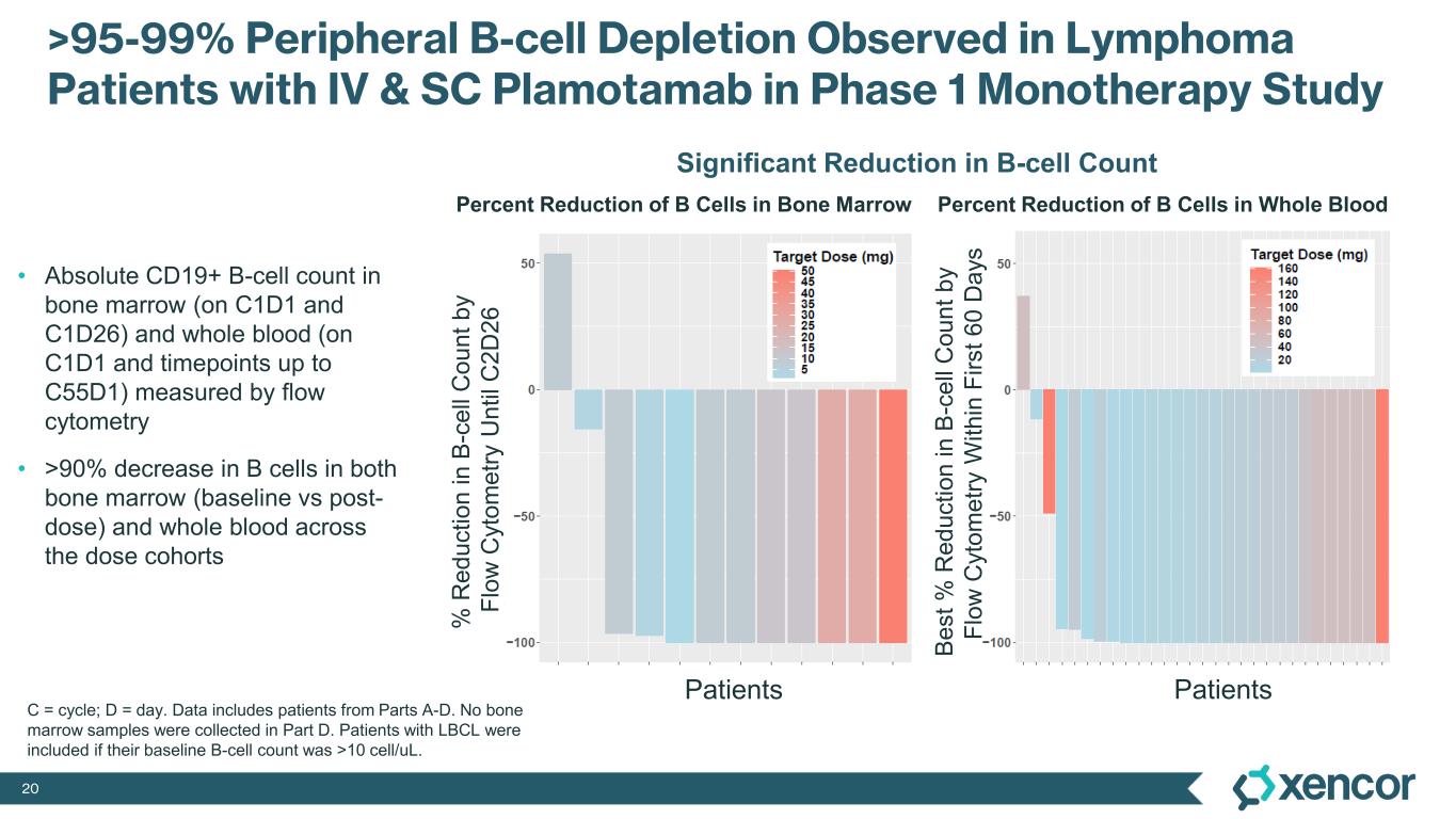 19 Day 0 (Predose) Day 4 Day 8 Day 30 0 1 2 3 B ce ll / T c el l ( C D 40 + / C D 8+ ) Low dose High dose Single Dose of Plamotamab in NHPs Durable B-cell Depletion Observed in Blood and Lymphoid Organs Blood B cells Lymph node B cellsBone marrow B cells Days post-dose C D 40 + B c el ls (v s ba se lin e) -7 0 7 14 21 28 0.0 0.2 0.4 0.6 0.8 1.0 1.2 Low dose High dose Day 0 (Predose) Day 4 Day 8 Day 30 0.0 0.5 1.0 1.5 2.0 2.5 B ce ll / T c el l ( C D 40 + / C D 8+ ) Low dose High dose