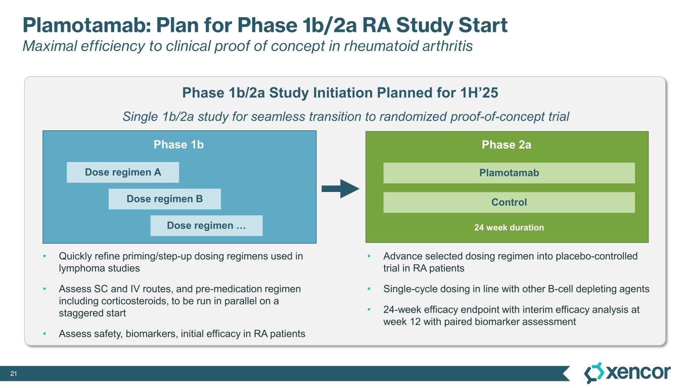 20 >95-99% Peripheral B-cell Depletion Observed in Lymphoma Patients with IV & SC Plamotamab in Phase 1 Monotherapy Study Significant Reduction in B-cell Count Percent Reduction of B Cells in Bone Marrow Percent Reduction of B Cells in Whole Blood % R ed uc tio n in B -c el l C ou nt b y Fl ow C yt om et ry U nt il C 2D 26 Be st % R ed uc tio n in B -c el l C ou nt b y Fl ow C yt om et ry W ith in F irs t 6 0 D ay s Patients Patients • Absolute CD19+ B-cell count in bone marrow (on C1D1 and C1D26) and whole blood (on C1D1 and timepoints up to C55D1) measured by flow cytometry • >90% decrease in B cells in both bone marrow (baseline vs post- dose) and whole blood across the dose cohorts C = cycle; D = day. Data includes patients from Parts A-D. No bone marrow samples were collected in Part D. Patients with LBCL were included if their baseline B-cell count was >10 cell/uL.