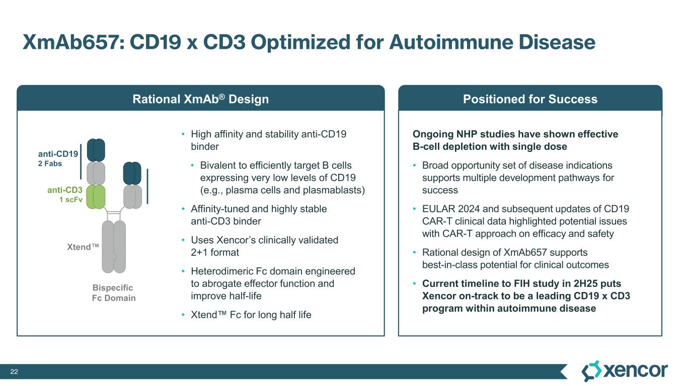 21 Plamotamab: Plan for Phase 1b/2a RA Study Start Maximal efficiency to clinical proof of concept in rheumatoid arthritis • Quickly refine priming/step-up dosing regimens used in lymphoma studies • Assess SC and IV routes, and pre-medication regimen including corticosteroids, to be run in parallel on a staggered start • Assess safety, biomarkers, initial efficacy in RA patients Plamotamab Control Phase 2a 24 week duration Phase 1b Dose regimen A Phase 1b/2a Study Initiation Planned for 1H’25 Dose regimen B Dose regimen … • Advance selected dosing regimen into placebo-controlled trial in RA patients • Single-cycle dosing in line with other B-cell depleting agents • 24-week efficacy endpoint with interim efficacy analysis at week 12 with paired biomarker assessment Single 1b/2a study for seamless transition to randomized proof-of-concept trial