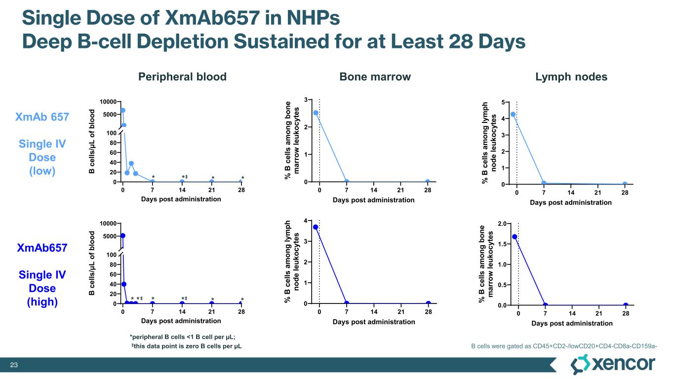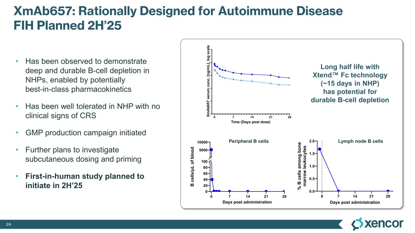23 0 7 14 21 28 0 20 40 60 80 100 5000 10000 Days post administration B c el ls /μ L of b lo od Single Dose of XmAb657 in NHPs Deep B-cell Depletion Sustained for at Least 28 Days XmAb 657 Single IV Dose (low) XmAb657 Single IV Dose (high) * * * * * * * *** Peripheral blood 0 7 14 21 28 0 20 40 60 80 100 5000 10000 Days post administration B c el ls /μ L of b lo od 0 7 14 21 28 0 1 2 3 4 Days post administration % B c el ls a m on g ly m ph no de le uk oc yt es 0 7 14 21 28 0 1 2 3 4 5 Days post administration % B c el ls a m on g ly m ph no de le uk oc yt es 0 7 14 21 28 0 1 2 3 Days post administration % B c el ls a m on g bo ne m ar ro w le uk oc yt es Bone marrow Lymph nodes 0 7 14 21 28 0.0 0.5 1.0 1.5 2.0 Days post administration % B c el ls a m on g bo ne m ar ro w le uk oc yt es *peripheral B cells <1 B cell per µL; ‡this data point is zero B cells per µL ‡‡ ‡ B cells were gated as CD45+CD2-/lowCD20+CD4-CD8a-CD159a-
