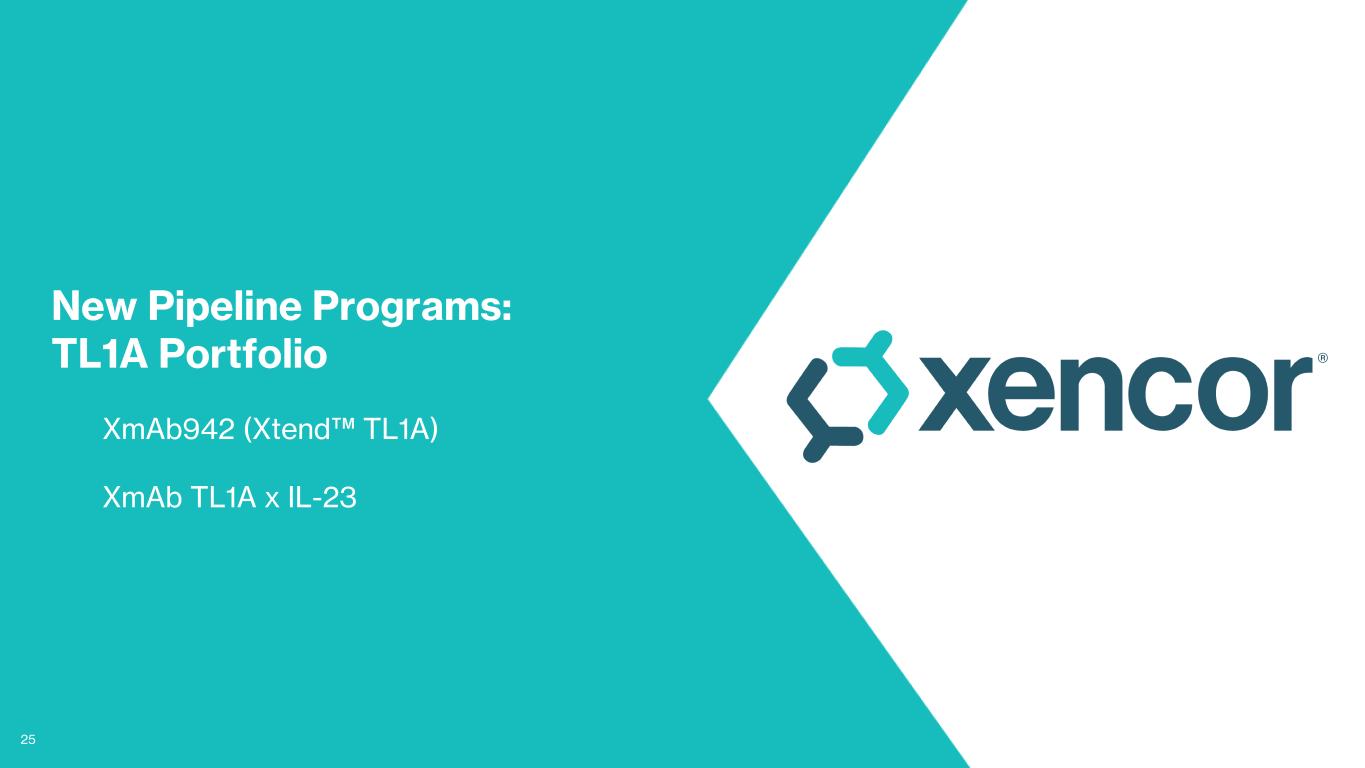 24 XmAb657: Rationally Designed for Autoimmune Disease FIH Planned 2H’25 • Has been observed to demonstrate deep and durable B-cell depletion in NHPs, enabled by potentially best-in-class pharmacokinetics • Has been well tolerated in NHP with no clinical signs of CRS • GMP production campaign initiated • Further plans to investigate subcutaneous dosing and priming • First-in-human study planned to initiate in 2H’25 0 7 14 21 28 Time (Days post dose) Xm A b6 57 s er um c on c. [n g/ m L] , l og s ca le Long half life with Xtend Fc technology (~15 days in NHP) has potential for durable B-cell depletion 0 7 14 21 28 0 20 40 60 80 100 5000 10000 Days post administration B c el ls / μ L of b lo od 0 7 14 21 28 0.0 0.5 1.0 1.5 2.0 Days post administration % B c el ls a m on g bo ne m ar ro w le uk oc yt es Peripheral B cells Lymph node B cells