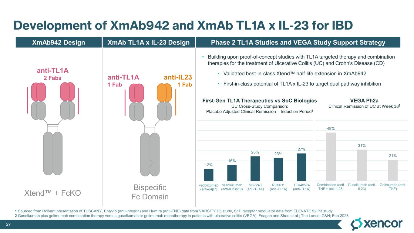 26 Inflammatory Bowel Disease (IBD) is a Devastating Disease with Significant Unmet Medical Need Abdominal pain Diarrhea Rectal bleeding Weight loss 1 Clarivate 2 GlobalData 3 Prescient whitepaper Global IBD drug spend projected to be $23bn+ by 20302 Two common forms: Crohn’s disease Ulcerative colitis ~3m Estimated diagnoses in the U.S.1 Significant Health Burden • Impaired quality of life • Lower life expectancy • Surgeries, hospitalization • Increased risk for intestinal resection • Increased risk for colorectal cancer Severe Symptoms of IBD • Fatigue • Fever • Reduced appetite • Mental health Current Standards of Care are Lacking S1P modulator 5-ASA Cortico- steroid α-TNF α-IL23 α-integrin JAK inhibitor Patients cycle through suboptimal treatments • Suboptimal efficacy: ~10-20% disease remission3 • Adverse events: Infection, malignancy, thromboembolism, cardiac • Burdensome regimens: poor patient compliance