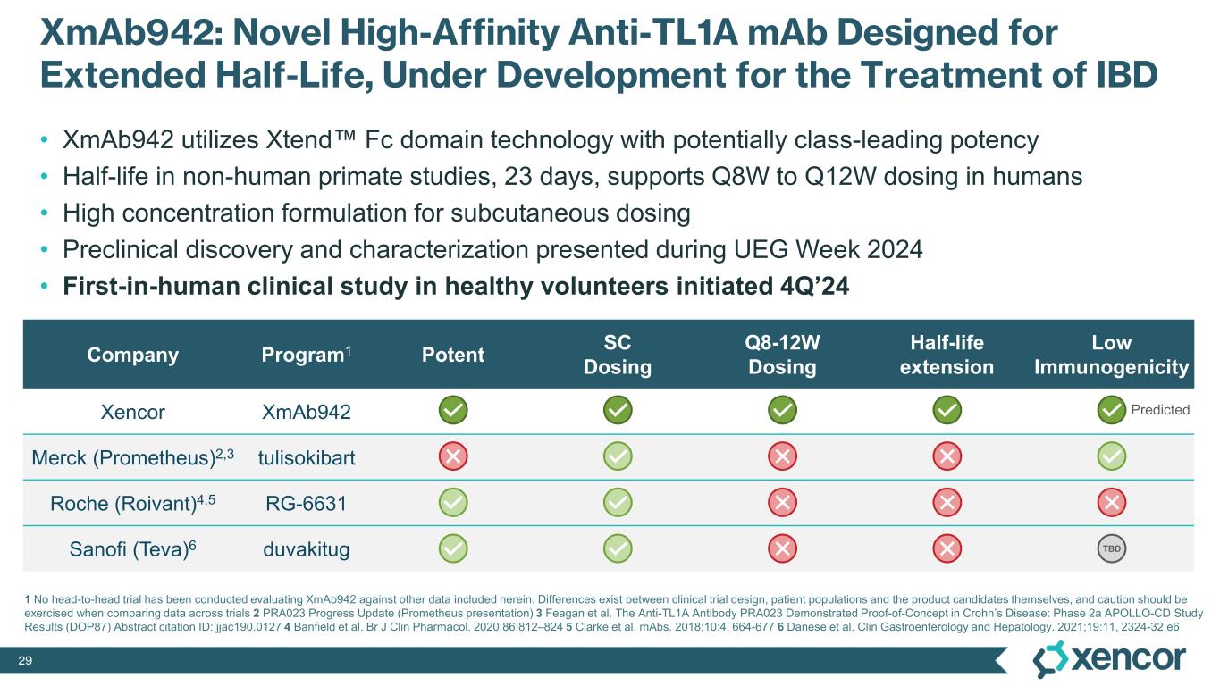 28 Xtend Fc: Validated Half-Life Extension (HLE) Technology Enabling Potential Best-in-Class Anti-TL1A Clinically validated with significantly improved half-life and dose frequency • Ultomiris half-life extended >4x as compared to Soliris; maintenance dose frequency reduced by 4X1 • VRC01LS half-life extended >4X as compared to parental (71 days vs 15 days)2 Similar safety and immunogenicity risk as parental antibodies in studied antibodies using Xtend Fc domains3,4,5 Antibody thermostability maintained in studied antibodies using Xtend Fc domains6,7 Superior or comparable to other HLE technologies (e.g., YTE) across multiple studies and parameters6,7,8 Typical HLE scaling from cyno to human is ~3.5x9 Clinical Half-Life and Maintenance Dosing Ultomiris vs. Soliris10 Product Half-life (days)11 Dosing Interval1,12 Ultomiris (with Xtend ) 49.7-64.3 Q8W Soliris 11.33-12.1 Q2W 1 Ultomiris & Soliris drug labels 2 Ledgerwood Clin Exp Imm 2015 3 Lee et al. Blood 2019 4 Gaudinski et al. PLOS Med 2018 5 Vu et al. J Neurol 2023 6 Ko et al. Exp Mol Med 2022 7 Internal Data 8 Ko et al. Nature Letter 2014 9 Haraya & Tachibana. BioDrugs (2023) 37:99–108 10 Data adapted from FDA and EMA drug labels 11 Reported Half-life across approved indications 12 Maintenance dosing interval in adults Proprietary Xtend Fc Domain has been incorporated into ≥ 35 molecules that have been tested in clinical studies Xtend is commonly referred to as ‘LS’ in academic literature