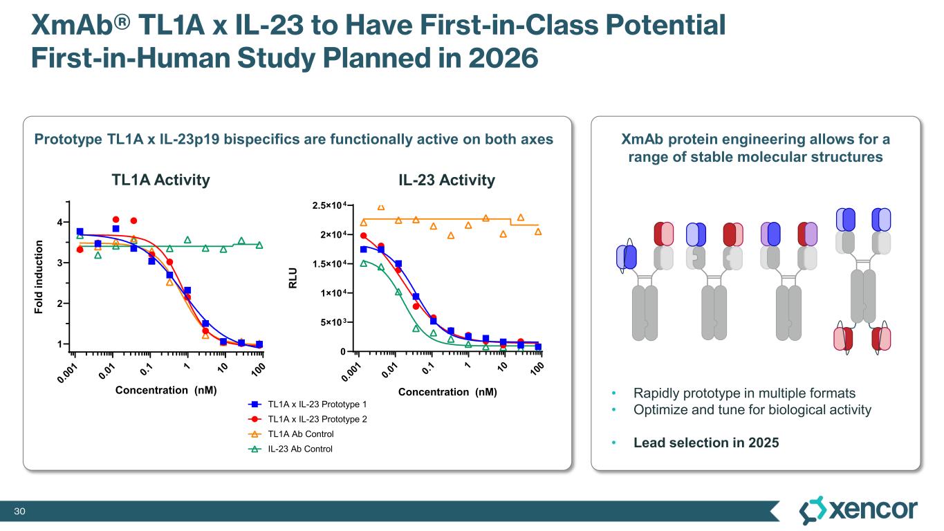 29 XmAb942: Novel High-Affinity Anti-TL1A mAb Designed for Extended Half-Life, Under Development for the Treatment of IBD • XmAb942 utilizes Xtend Fc domain technology with potentially class-leading potency • Half-life in non-human primate studies, 23 days, supports Q8W to Q12W dosing in humans • High concentration formulation for subcutaneous dosing • Preclinical discovery and characterization presented during UEG Week 2024 • First-in-human clinical study in healthy volunteers initiated 4Q’24 Company Program1 Potent SC Dosing Q8-12W Dosing Half-life extension Low Immunogenicity Xencor XmAb942 Merck (Prometheus)2,3 tulisokibart Roche (Roivant)4,5 RG-6631 Sanofi (Teva)6 duvakitug TBD Predicted 1 No head-to-head trial has been conducted evaluating XmAb942 against other data included herein. Differences exist between clinical trial design, patient populations and the product candidates themselves, and caution should be exercised when comparing data across trials 2 PRA023 Progress Update (Prometheus presentation) 3 Feagan et al. The Anti-TL1A Antibody PRA023 Demonstrated Proof-of-Concept in Crohn’s Disease: Phase 2a APOLLO-CD Study Results (DOP87) Abstract citation ID: jjac190.0127 4 Banfield et al. Br J Clin Pharmacol. 2020;86:812–824 5 Clarke et al. mAbs. 2018;10:4, 664-677 6 Danese et al. Clin Gastroenterology and Hepatology. 2021;19:11, 2324-32.e6