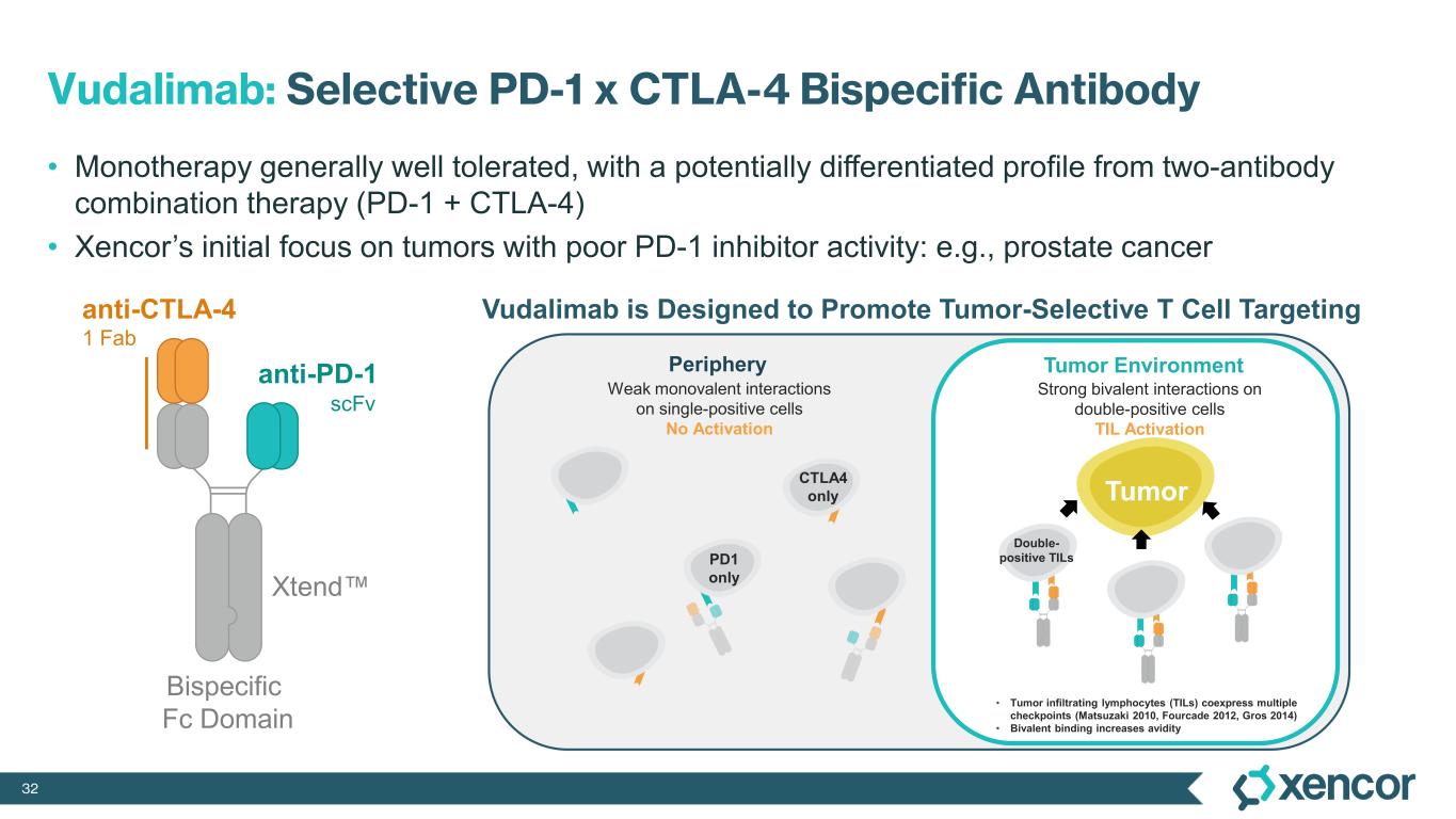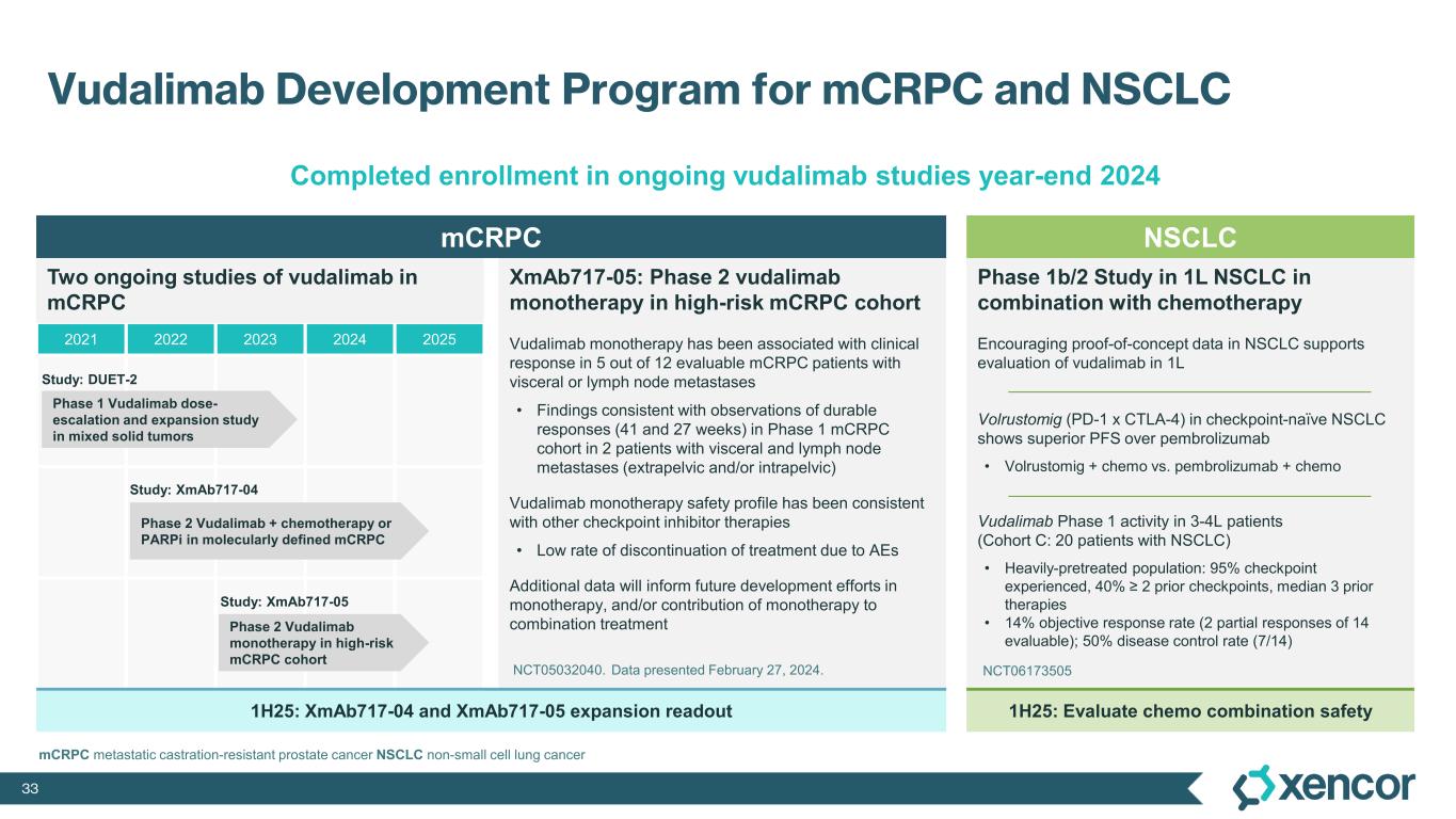 32 Vudalimab: Selective PD-1 x CTLA-4 Bispecific Antibody • Monotherapy generally well tolerated, with a potentially differentiated profile from two-antibody combination therapy (PD-1 + CTLA-4) • Xencor’s initial focus on tumors with poor PD-1 inhibitor activity: e.g., prostate cancer anti-PD-1 scFv anti-CTLA-4 1 Fab Xtend Bispecific Fc Domain • Tumor infiltrating lymphocytes (TILs) coexpress multiple checkpoints (Matsuzaki 2010, Fourcade 2012, Gros 2014) • Bivalent binding increases avidity Periphery Strong bivalent interactions on double-positive cells TIL Activation Weak monovalent interactions on single-positive cells No Activation Tumor Environment  Tumor PD1 only CTLA4 only Double- positive TILs Vudalimab is Designed to Promote Tumor-Selective T Cell Targeting