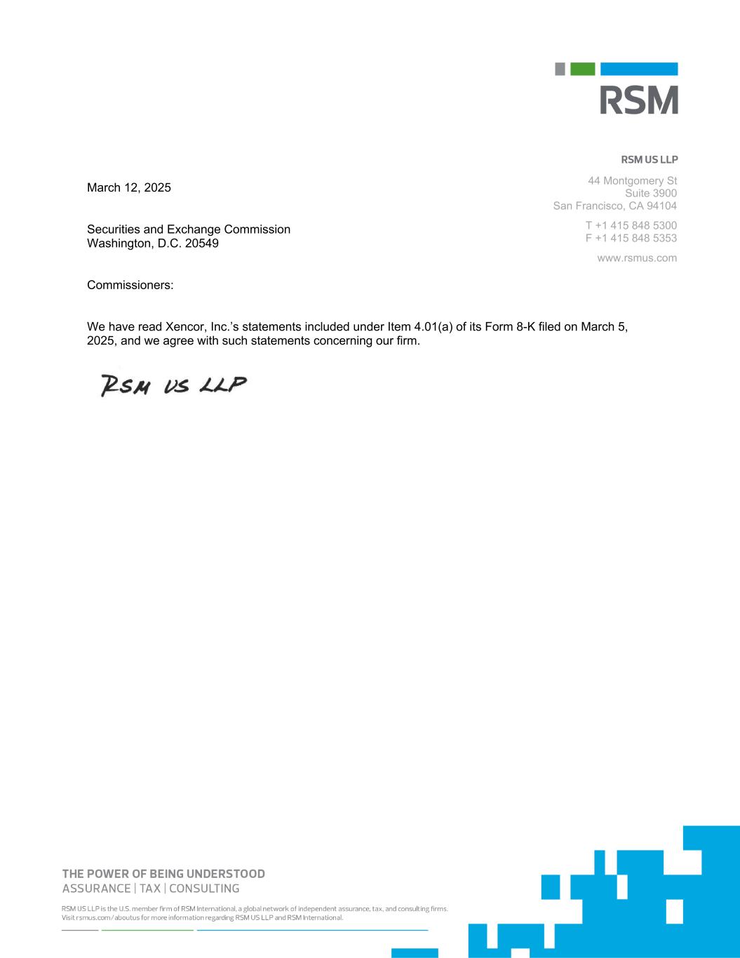 44 Montgomery St Suite 3900 San Francisco, CA 94104 T +1 415 848 5300 F +1 415 848 5353 www.rsmus.com March 12, 2025 Securities and Exchange Commission Washington, D.C. 20549 Commissioners: We have read Xencor, Inc.’s statements included under Item 4.01(a) of its Form 8-K filed on March 5, 2025, and we agree with such statements concerning our firm.