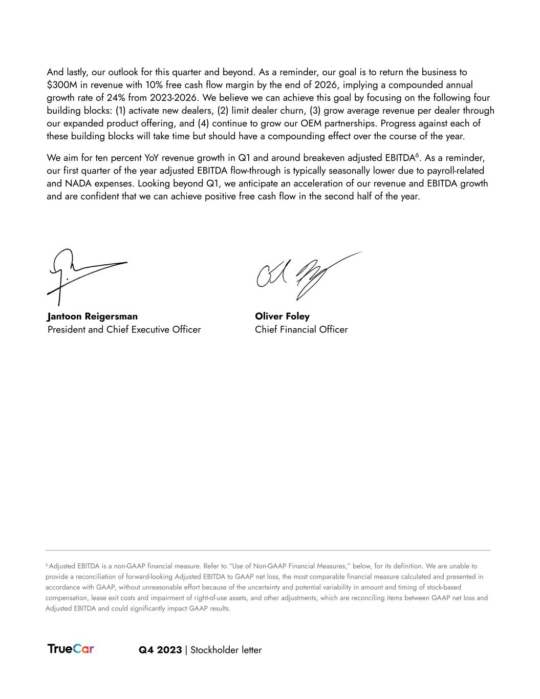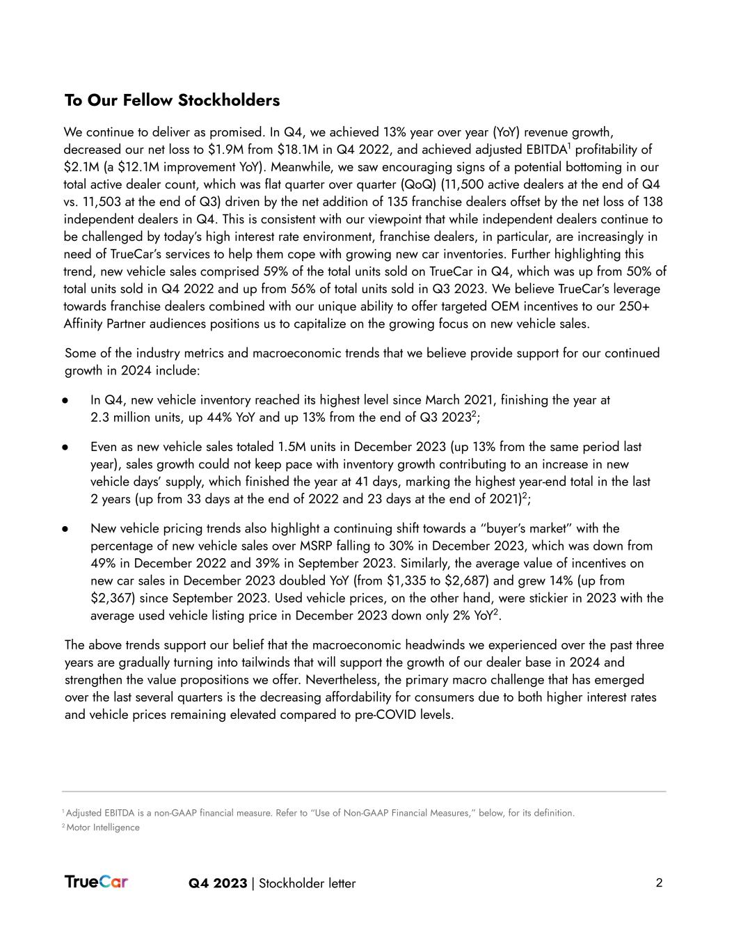 Q4 2023 | Stockholder letter To Our Fellow Stockholders We continue to deliver as promised. In Q4, we achieved 13% year over year (YoY) revenue growth, decreased our net loss to $1.9M from $18.1M in Q4 2022, and achieved adjusted EBITDA1 profitability of $2.1M (a $12.1M improvement YoY). Meanwhile, we saw encouraging signs of a potential bottoming in our total active dealer count, which was flat quarter over quarter (QoQ) (11,500 active dealers at the end of Q4 vs. 11,503 at the end of Q3) driven by the net addition of 135 franchise dealers offset by the net loss of 138 independent dealers in Q4. This is consistent with our viewpoint that while independent dealers continue to be challenged by today’s high interest rate environment, franchise dealers, in particular, are increasingly in need of TrueCar’s services to help them cope with growing new car inventories. Further highlighting this trend, new vehicle sales comprised 59% of the total units sold on TrueCar in Q4, which was up from 50% of total units sold in Q4 2022 and up from 56% of total units sold in Q3 2023. We believe TrueCar’s leverage towards franchise dealers combined with our unique ability to offer targeted OEM incentives to our 250+ Affinity Partner audiences positions us to capitalize on the growing focus on new vehicle sales. Some of the industry metrics and macroeconomic trends that we believe provide support for our continued growth in 2024 include: ● In Q4, new vehicle inventory reached its highest level since March 2021, finishing the year at 2.3 million units, up 44% YoY and up 13% from the end of Q3 20232; ● Even as new vehicle sales totaled 1.5M units in December 2023 (up 13% from the same period last year), sales growth could not keep pace with inventory growth contributing to an increase in new vehicle days’ supply, which finished the year at 41 days, marking the highest year-end total in the last 2 years (up from 33 days at the end of 2022 and 23 days at the end of 2021)2; ● New vehicle pricing trends also highlight a continuing shift towards a “buyer’s market” with the percentage of new vehicle sales over MSRP falling to 30% in December 2023, which was down from 49% in December 2022 and 39% in September 2023. Similarly, the average value of incentives on new car sales in December 2023 doubled YoY (from $1,335 to $2,687) and grew 14% (up from $2,367) since September 2023. Used vehicle prices, on the other hand, were stickier in 2023 with the average used vehicle listing price in December 2023 down only 2% YoY2. The above trends support our belief that the macroeconomic headwinds we experienced over the past three years are gradually turning into tailwinds that will support the growth of our dealer base in 2024 and strengthen the value propositions we offer. Nevertheless, the primary macro challenge that has emerged over the last several quarters is the decreasing affordability for consumers due to both higher interest rates and vehicle prices remaining elevated compared to pre-COVID levels. 2 1 Adjusted EBITDA is a non-GAAP financial measure. Refer to “Use of Non-GAAP Financial Measures,” below, for its definition. 2 Motor Intelligence