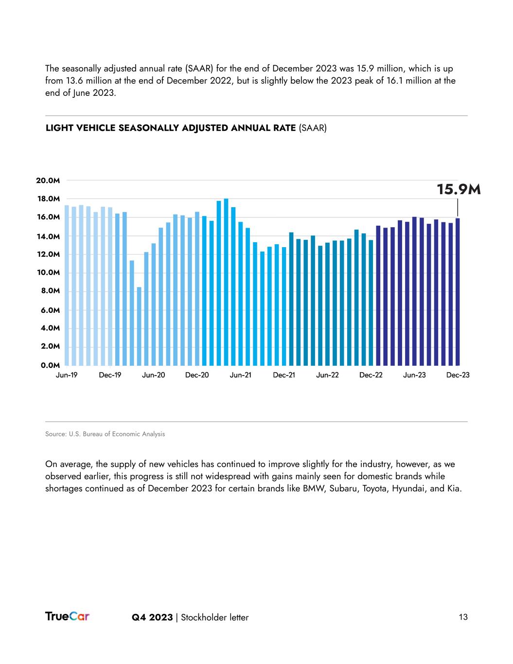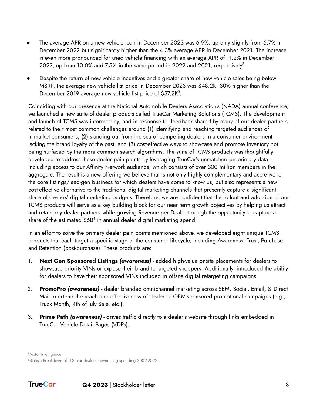 Q4 2023 | Stockholder letter ● The average APR on a new vehicle loan in December 2023 was 6.9%, up only slightly from 6.7% in December 2022 but significantly higher than the 4.3% average APR in December 2021. The increase is even more pronounced for used vehicle financing with an average APR of 11.2% in December 2023, up from 10.0% and 7.5% in the same period in 2022 and 2021, respectively3. ● Despite the return of new vehicle incentives and a greater share of new vehicle sales being below MSRP, the average new vehicle list price in December 2023 was $48.2K, 30% higher than the December 2019 average new vehicle list price of $37.2K3. Coinciding with our presence at the National Automobile Dealers Association's (NADA) annual conference, we launched a new suite of dealer products called TrueCar Marketing Solutions (TCMS). The development and launch of TCMS was informed by, and in response to, feedback shared by many of our dealer partners related to their most common challenges around (1) identifying and reaching targeted audiences of in-market consumers, (2) standing out from the sea of competing dealers in a consumer environment lacking the brand loyalty of the past, and (3) cost-effective ways to showcase and promote inventory not being surfaced by the more common search algorithms. The suite of TCMS products was thoughtfully developed to address these dealer pain points by leveraging TrueCar’s unmatched proprietary data – including access to our Affinity Network audience, which consists of over 300 million members in the aggregate. The result is a new offering we believe that is not only highly complementary and accretive to the core listings/lead-gen business for which dealers have come to know us, but also represents a new cost-effective alternative to the traditional digital marketing channels that presently capture a significant share of dealers’ digital marketing budgets. Therefore, we are confident that the rollout and adoption of our TCMS products will serve as a key building block for our near term growth objectives by helping us attract and retain key dealer partners while growing Revenue per Dealer through the opportunity to capture a share of the estimated $6B4 in annual dealer digital marketing spend. In an effort to solve the primary dealer pain points mentioned above, we developed eight unique TCMS products that each target a specific stage of the consumer lifecycle, including Awareness, Trust, Purchase and Retention (post-purchase). These products are: 1. Next Gen Sponsored Listings (awareness) - added high-value onsite placements for dealers to showcase priority VINs or expose their brand to targeted shoppers. Additionally, introduced the ability for dealers to have their sponsored VINs included in offsite digital retargeting campaigns. 2. PromoPro (awareness) - dealer branded omnichannel marketing across SEM, Social, Email, & Direct Mail to extend the reach and effectiveness of dealer or OEM-sponsored promotional campaigns (e.g., Truck Month, 4th of July Sale, etc.). 3. Prime Path (awareness) - drives traffic directly to a dealer’s website through links embedded in TrueCar Vehicle Detail Pages (VDPs). 3 3 Motor Intelligence 4 Statista Breakdown of U.S. car dealers' advertising spending 2002-2022