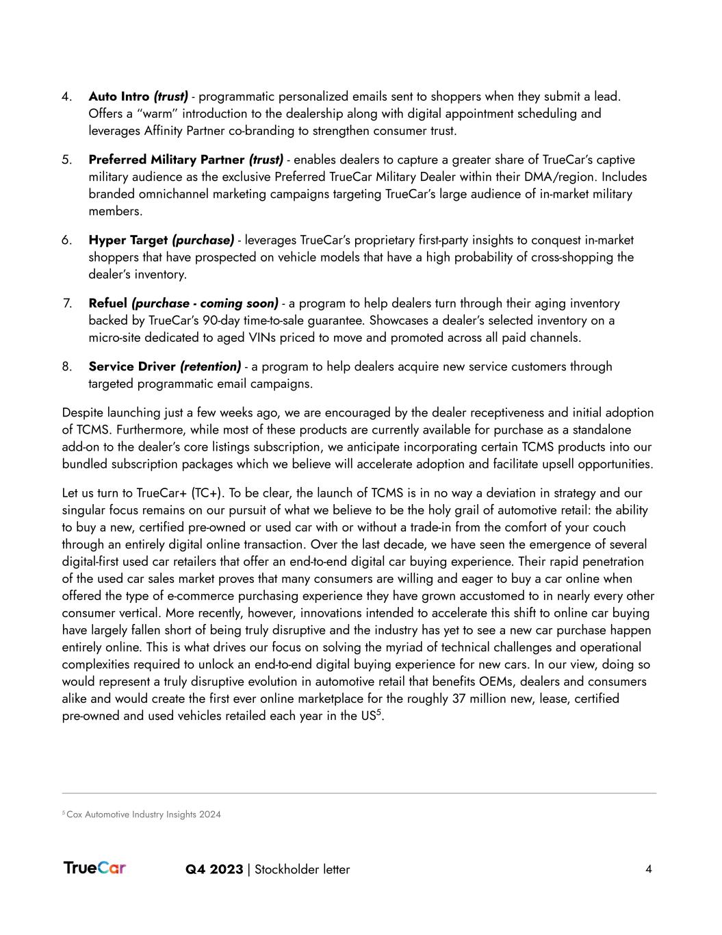 Q4 2023 | Stockholder letter 4. Auto Intro (trust) - programmatic personalized emails sent to shoppers when they submit a lead. Offers a “warm” introduction to the dealership along with digital appointment scheduling and leverages Affinity Partner co-branding to strengthen consumer trust. 5. Preferred Military Partner (trust) - enables dealers to capture a greater share of TrueCar’s captive military audience as the exclusive Preferred TrueCar Military Dealer within their DMA/region. Includes branded omnichannel marketing campaigns targeting TrueCar’s large audience of in-market military members. 6. Hyper Target (purchase) - leverages TrueCar’s proprietary first-party insights to conquest in-market shoppers that have prospected on vehicle models that have a high probability of cross-shopping the dealer’s inventory. 7. Refuel (purchase - coming soon) - a program to help dealers turn through their aging inventory backed by TrueCar’s 90-day time-to-sale guarantee. Showcases a dealer’s selected inventory on a micro-site dedicated to aged VINs priced to move and promoted across all paid channels. 8. Service Driver (retention) - a program to help dealers acquire new service customers through targeted programmatic email campaigns. Despite launching just a few weeks ago, we are encouraged by the dealer receptiveness and initial adoption of TCMS. Furthermore, while most of these products are currently available for purchase as a standalone add-on to the dealer’s core listings subscription, we anticipate incorporating certain TCMS products into our bundled subscription packages which we believe will accelerate adoption and facilitate upsell opportunities. Let us turn to TrueCar+ (TC+). To be clear, the launch of TCMS is in no way a deviation in strategy and our singular focus remains on our pursuit of what we believe to be the holy grail of automotive retail: the ability to buy a new, certified pre-owned or used car with or without a trade-in from the comfort of your couch through an entirely digital online transaction. Over the last decade, we have seen the emergence of several digital-first used car retailers that offer an end-to-end digital car buying experience. Their rapid penetration of the used car sales market proves that many consumers are willing and eager to buy a car online when offered the type of e-commerce purchasing experience they have grown accustomed to in nearly every other consumer vertical. More recently, however, innovations intended to accelerate this shift to online car buying have largely fallen short of being truly disruptive and the industry has yet to see a new car purchase happen entirely online. This is what drives our focus on solving the myriad of technical challenges and operational complexities required to unlock an end-to-end digital buying experience for new cars. In our view, doing so would represent a truly disruptive evolution in automotive retail that benefits OEMs, dealers and consumers alike and would create the first ever online marketplace for the roughly 37 million new, lease, certified pre-owned and used vehicles retailed each year in the US5. 5 Cox Automotive Industry Insights 2024 4