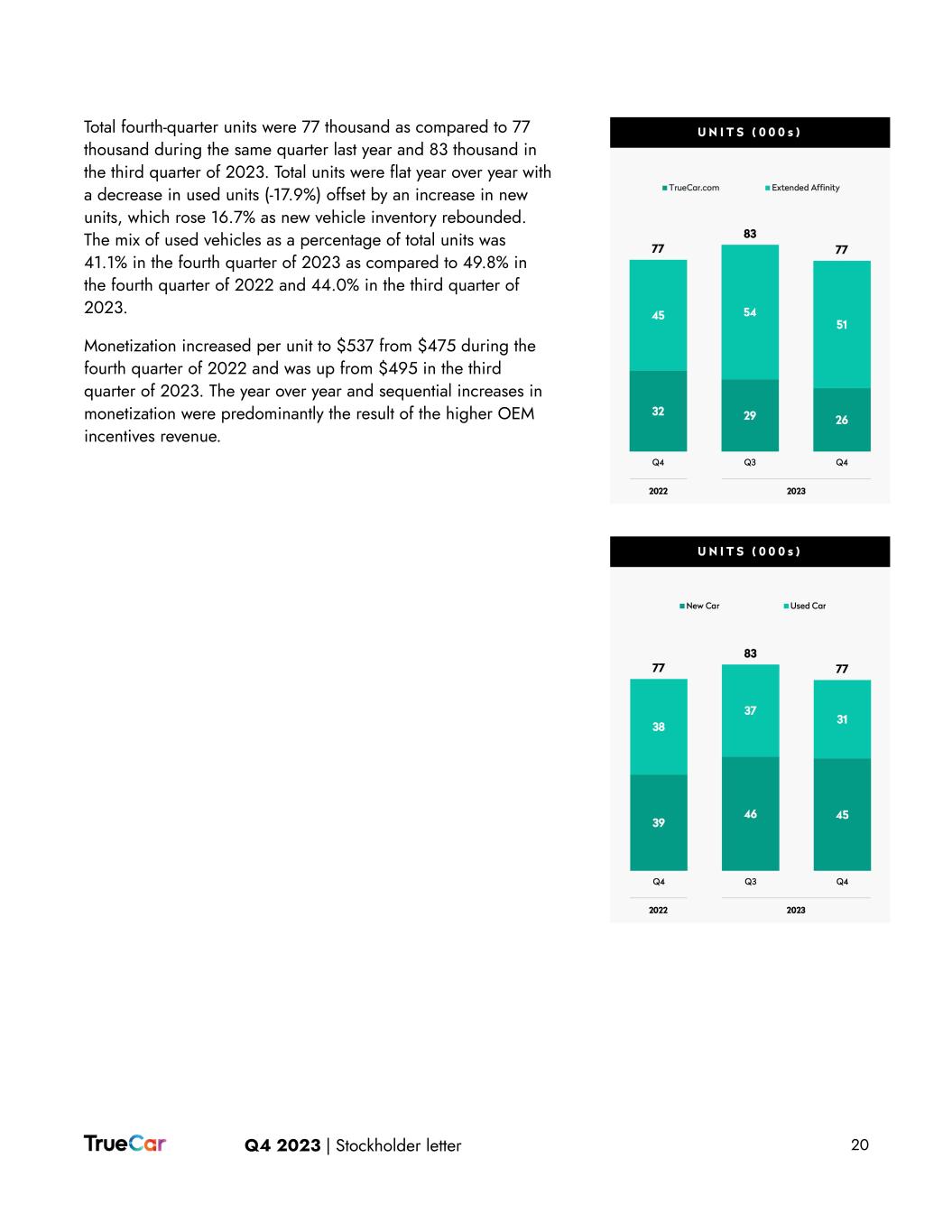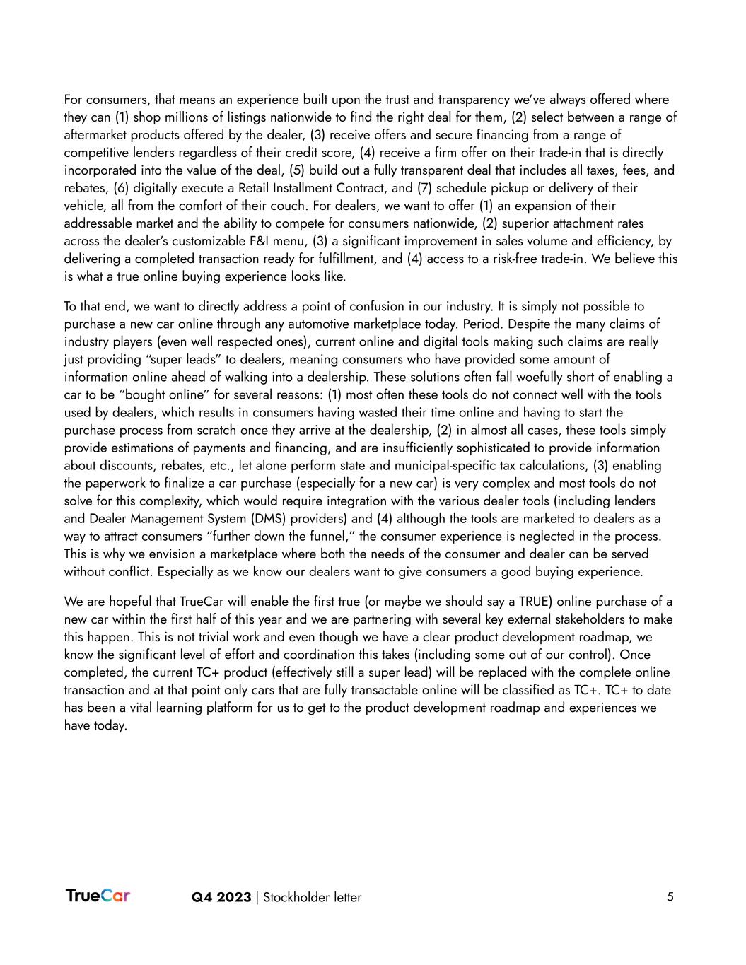 Q4 2023 | Stockholder letter For consumers, that means an experience built upon the trust and transparency we’ve always offered where they can (1) shop millions of listings nationwide to find the right deal for them, (2) select between a range of aftermarket products offered by the dealer, (3) receive offers and secure financing from a range of competitive lenders regardless of their credit score, (4) receive a firm offer on their trade-in that is directly incorporated into the value of the deal, (5) build out a fully transparent deal that includes all taxes, fees, and rebates, (6) digitally execute a Retail Installment Contract, and (7) schedule pickup or delivery of their vehicle, all from the comfort of their couch. For dealers, we want to offer (1) an expansion of their addressable market and the ability to compete for consumers nationwide, (2) superior attachment rates across the dealer’s customizable F&I menu, (3) a significant improvement in sales volume and efficiency, by delivering a completed transaction ready for fulfillment, and (4) access to a risk-free trade-in. We believe this is what a true online buying experience looks like. To that end, we want to directly address a point of confusion in our industry. It is simply not possible to purchase a new car online through any automotive marketplace today. Period. Despite the many claims of industry players (even well respected ones), current online and digital tools making such claims are really just providing “super leads” to dealers, meaning consumers who have provided some amount of information online ahead of walking into a dealership. These solutions often fall woefully short of enabling a car to be “bought online” for several reasons: (1) most often these tools do not connect well with the tools used by dealers, which results in consumers having wasted their time online and having to start the purchase process from scratch once they arrive at the dealership, (2) in almost all cases, these tools simply provide estimations of payments and financing, and are insufficiently sophisticated to provide information about discounts, rebates, etc., let alone perform state and municipal-specific tax calculations, (3) enabling the paperwork to finalize a car purchase (especially for a new car) is very complex and most tools do not solve for this complexity, which would require integration with the various dealer tools (including lenders and Dealer Management System (DMS) providers) and (4) although the tools are marketed to dealers as a way to attract consumers “further down the funnel,” the consumer experience is neglected in the process. This is why we envision a marketplace where both the needs of the consumer and dealer can be served without conflict. Especially as we know our dealers want to give consumers a good buying experience. We are hopeful that TrueCar will enable the first true (or maybe we should say a TRUE) online purchase of a new car within the first half of this year and we are partnering with several key external stakeholders to make this happen. This is not trivial work and even though we have a clear product development roadmap, we know the significant level of effort and coordination this takes (including some out of our control). Once completed, the current TC+ product (effectively still a super lead) will be replaced with the complete online transaction and at that point only cars that are fully transactable online will be classified as TC+. TC+ to date has been a vital learning platform for us to get to the product development roadmap and experiences we have today. 5