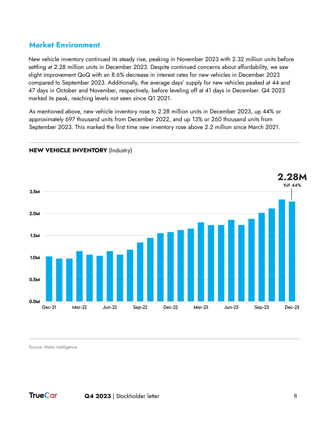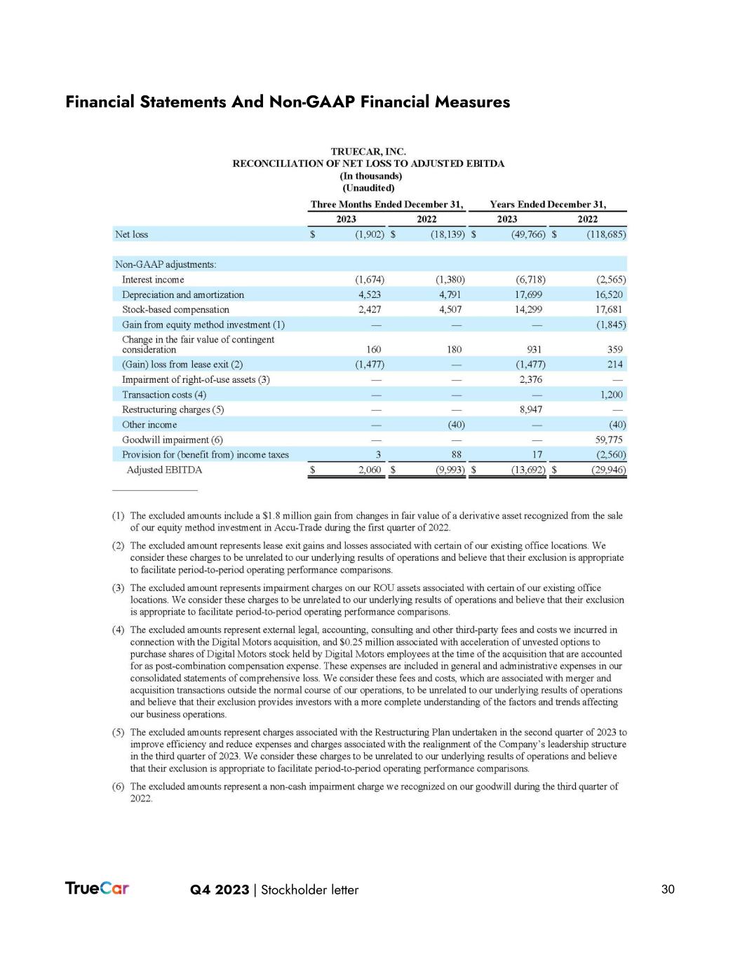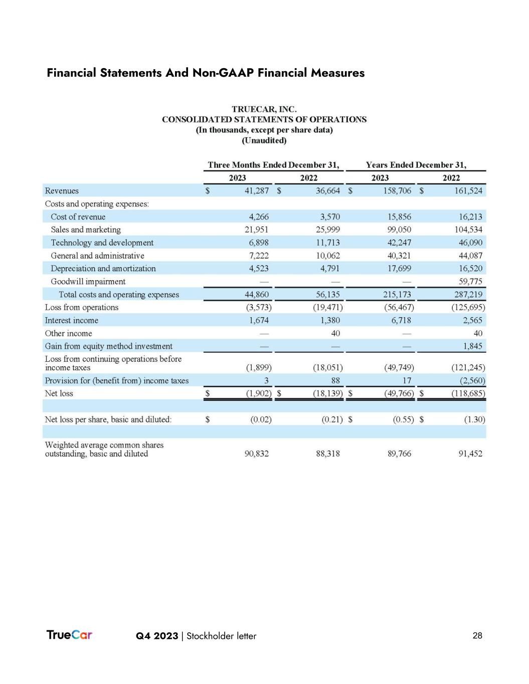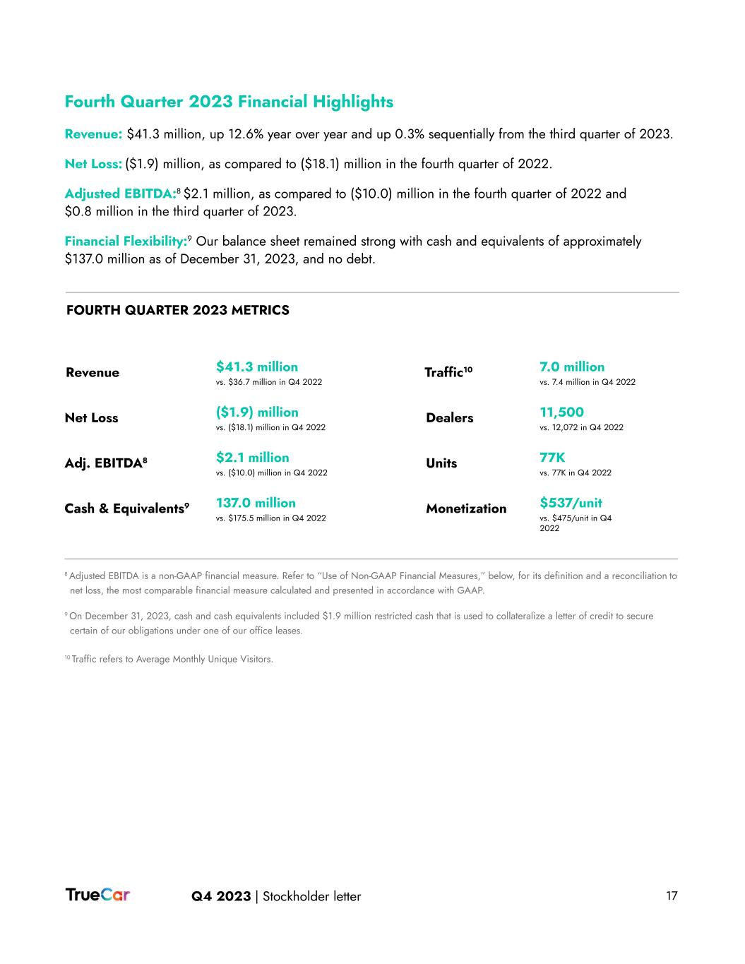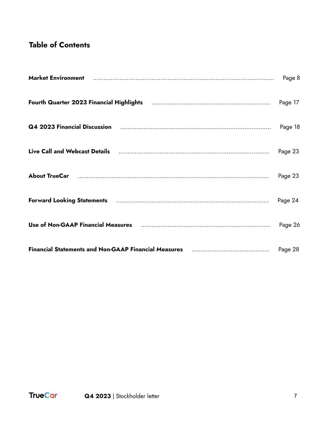 Q4 2023 | Stockholder letter Table of Contents Market Environment ……………………………………………..……………………………..………..… Page 8 Fourth Quarter 2023 Financial Highlights ………………….…………….……………………..… Page 17 Q4 2023 Financial Discussion …………………………………………………….………..…..…..… Page 18 Live Call and Webcast Details ……………….………………………………………….…………..… Page 23 About TrueCar …………………………………………………………………………………...….…..… Page 23 Forward Looking Statements …………………………………………….……….………….……..… Page 24 Use of Non-GAAP Financial Measures ………………………………………….….……………..… Page 26 Financial Statements and Non-GAAP Financial Measures ……………………………..……… Page 28 7