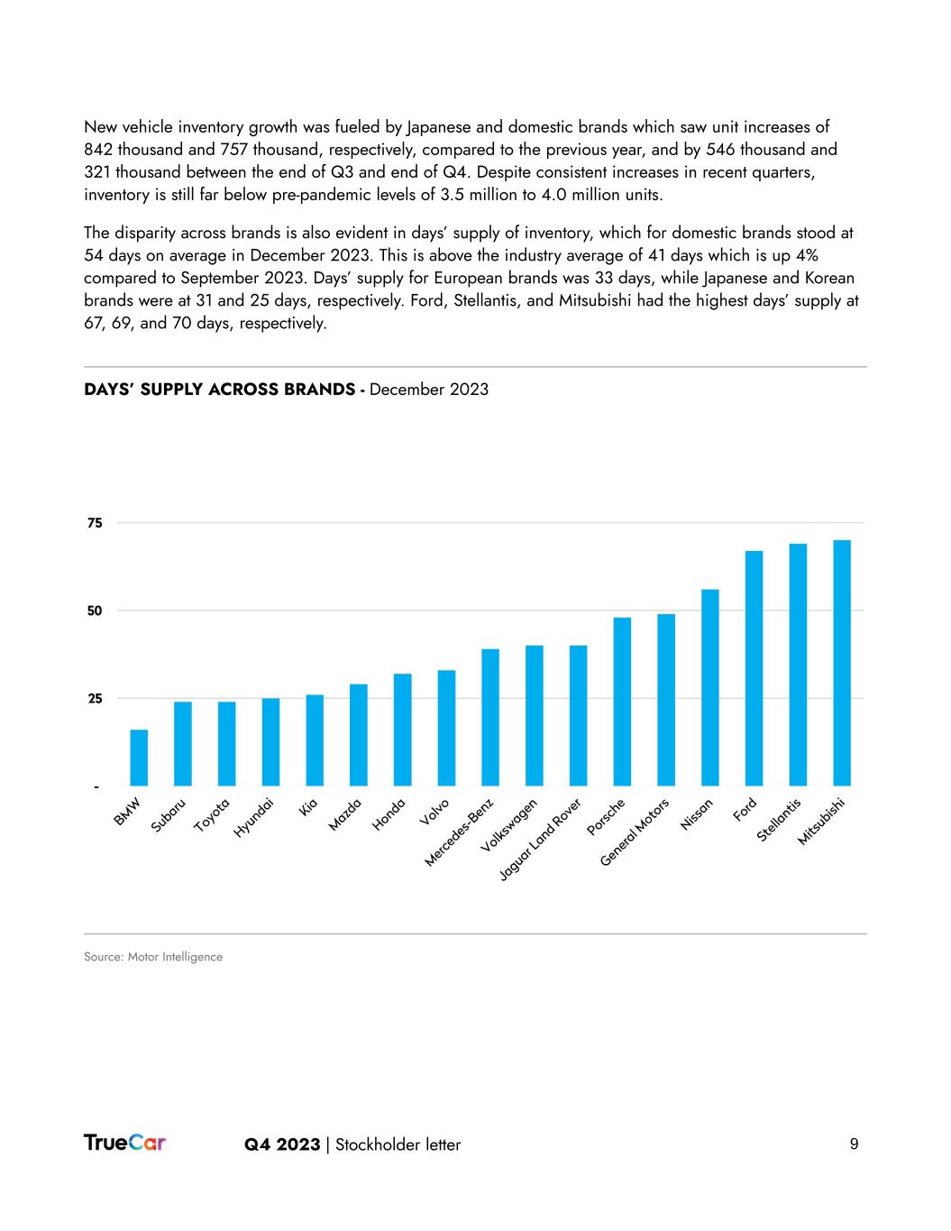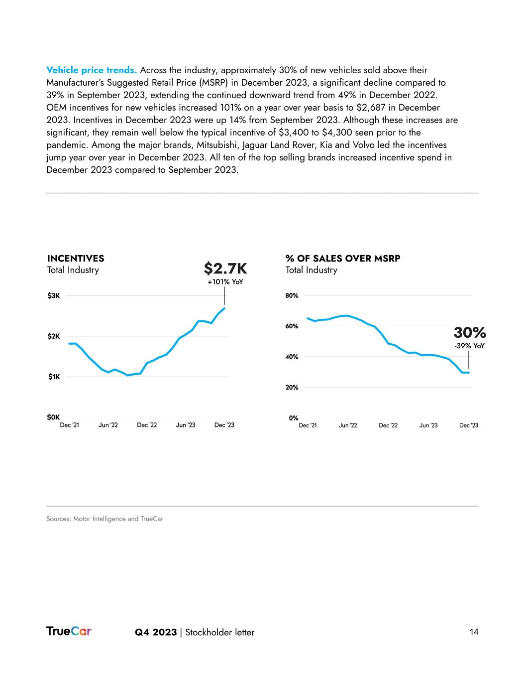 Q4 2023 | Stockholder letter Vehicle price trends. Across the industry, approximately 30% of new vehicles sold above their Manufacturer’s Suggested Retail Price (MSRP) in December 2023, a significant decline compared to 39% in September 2023, extending the continued downward trend from 49% in December 2022. OEM incentives for new vehicles increased 101% on a year over year basis to $2,687 in December 2023. Incentives in December 2023 were up 14% from September 2023. Although these increases are significant, they remain well below the typical incentive of $3,400 to $4,300 seen prior to the pandemic. Among the major brands, Mitsubishi, Jaguar Land Rover, Kia and Volvo led the incentives jump year over year in December 2023. All ten of the top selling brands increased incentive spend in December 2023 compared to September 2023. 14 Sources: Motor Intelligence and TrueCar INCENTIVES Total Industry % OF SALES OVER MSRP Total Industry$2.7K +101% YoY 30% -39% YoY