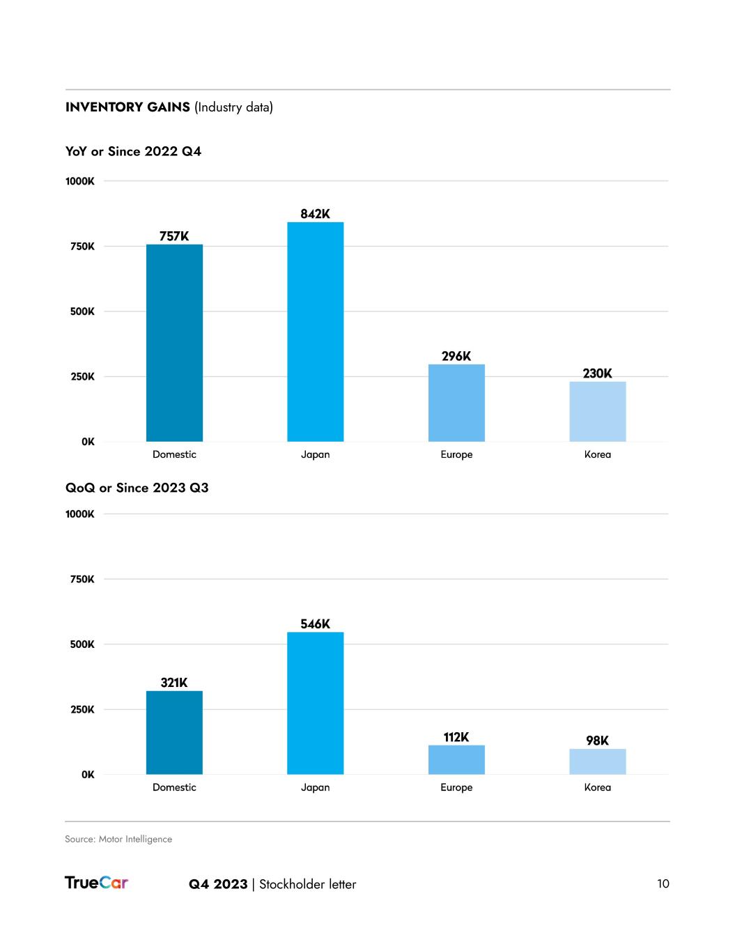 Q4 2023 | Stockholder letter 9 New vehicle inventory growth was fueled by Japanese and domestic brands which saw unit increases of 842 thousand and 757 thousand, respectively, compared to the previous year, and by 546 thousand and 321 thousand between the end of Q3 and end of Q4. Despite consistent increases in recent quarters, inventory is still far below pre-pandemic levels of 3.5 million to 4.0 million units. The disparity across brands is also evident in days’ supply of inventory, which for domestic brands stood at 54 days on average in December 2023. This is above the industry average of 41 days which is up 4% compared to September 2023. Days’ supply for European brands was 33 days, while Japanese and Korean brands were at 31 and 25 days, respectively. Ford, Stellantis, and Mitsubishi had the highest days’ supply at 67, 69, and 70 days, respectively. DAYS’ SUPPLY ACROSS BRANDS - December 2023 Source: Motor Intelligence