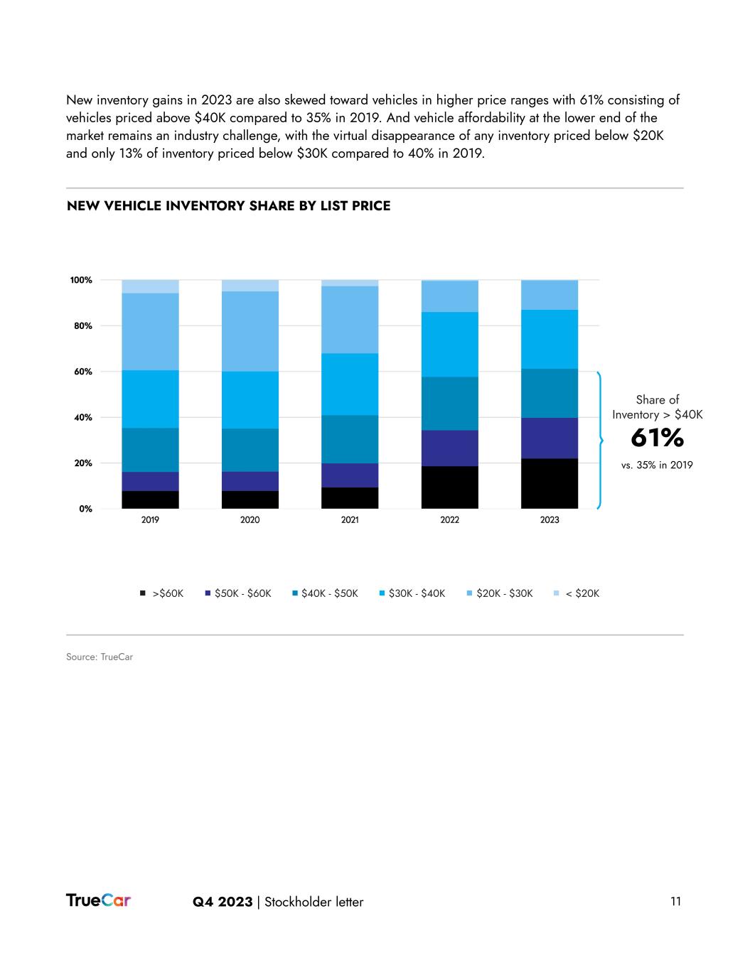 Q4 2023 | Stockholder letter 11 New inventory gains in 2023 are also skewed toward vehicles in higher price ranges with 61% consisting of vehicles priced above $40K compared to 35% in 2019. And vehicle affordability at the lower end of the market remains an industry challenge, with the virtual disappearance of any inventory priced below $20K and only 13% of inventory priced below $30K compared to 40% in 2019. >$60K $50K - $60K $40K - $50K $30K - $40K $20K - $30K < $20K Source: TrueCar NEW VEHICLE INVENTORY SHARE BY LIST PRICE Share of Inventory > $40K 61% vs. 35% in 2019
