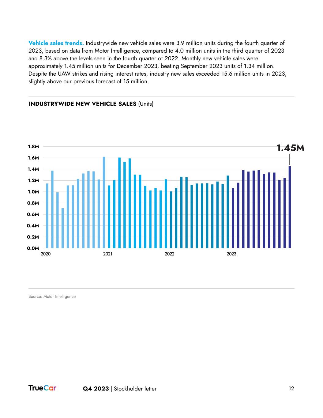 Q4 2023 | Stockholder letter Vehicle sales trends. Industrywide new vehicle sales were 3.9 million units during the fourth quarter of 2023, based on data from Motor Intelligence, compared to 4.0 million units in the third quarter of 2023 and 8.3% above the levels seen in the fourth quarter of 2022. Monthly new vehicle sales were approximately 1.45 million units for December 2023, beating September 2023 units of 1.34 million. Despite the UAW strikes and rising interest rates, industry new sales exceeded 15.6 million units in 2023, slightly above our previous forecast of 15 million. 12 INDUSTRYWIDE NEW VEHICLE SALES (Units) Source: Motor Intelligence 1.45M1.8M 1.6M 1.4M 1.2M 1.0M 0.8M 0.6M 0.4M 0.2M 0.0M