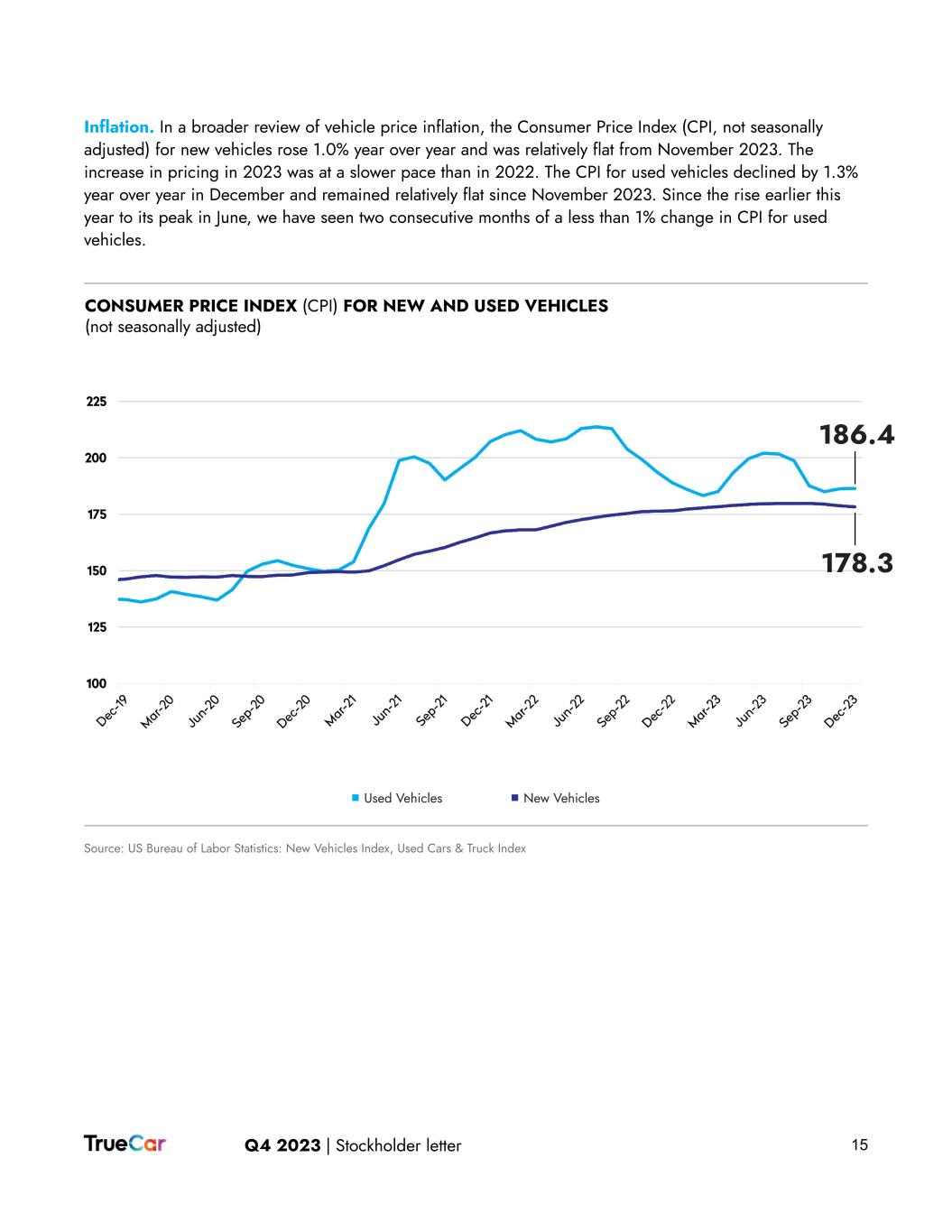 Q4 2023 | Stockholder letter Inflation. In a broader review of vehicle price inflation, the Consumer Price Index (CPI, not seasonally adjusted) for new vehicles rose 1.0% year over year and was relatively flat from November 2023. The increase in pricing in 2023 was at a slower pace than in 2022. The CPI for used vehicles declined by 1.3% year over year in December and remained relatively flat since November 2023. Since the rise earlier this year to its peak in June, we have seen two consecutive months of a less than 1% change in CPI for used vehicles. 15 Source: US Bureau of Labor Statistics: New Vehicles Index, Used Cars & Truck Index CONSUMER PRICE INDEX (CPI) FOR NEW AND USED VEHICLES (not seasonally adjusted) Used Vehicles New Vehicles 186.4 178.3