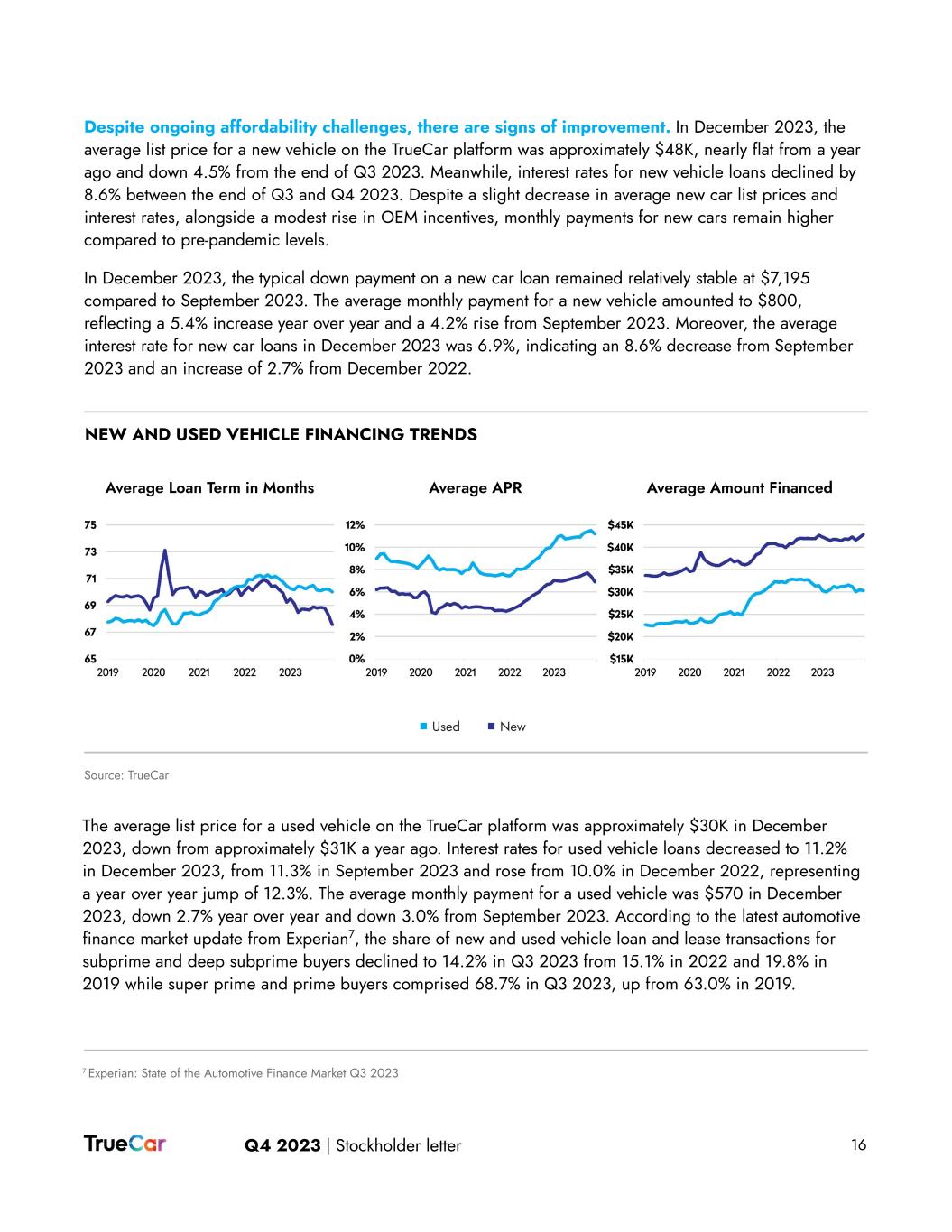 Q4 2023 | Stockholder letter Despite ongoing affordability challenges, there are signs of improvement. In December 2023, the average list price for a new vehicle on the TrueCar platform was approximately $48K, nearly flat from a year ago and down 4.5% from the end of Q3 2023. Meanwhile, interest rates for new vehicle loans declined by 8.6% between the end of Q3 and Q4 2023. Despite a slight decrease in average new car list prices and interest rates, alongside a modest rise in OEM incentives, monthly payments for new cars remain higher compared to pre-pandemic levels. In December 2023, the typical down payment on a new car loan remained relatively stable at $7,195 compared to September 2023. The average monthly payment for a new vehicle amounted to $800, reflecting a 5.4% increase year over year and a 4.2% rise from September 2023. Moreover, the average interest rate for new car loans in December 2023 was 6.9%, indicating an 8.6% decrease from September 2023 and an increase of 2.7% from December 2022. 16 7 Experian: State of the Automotive Finance Market Q3 2023 NEW AND USED VEHICLE FINANCING TRENDS Source: TrueCar Used New Average Loan Term in Months Average APR Average Amount Financed The average list price for a used vehicle on the TrueCar platform was approximately $30K in December 2023, down from approximately $31K a year ago. Interest rates for used vehicle loans decreased to 11.2% in December 2023, from 11.3% in September 2023 and rose from 10.0% in December 2022, representing a year over year jump of 12.3%. The average monthly payment for a used vehicle was $570 in December 2023, down 2.7% year over year and down 3.0% from September 2023. According to the latest automotive finance market update from Experian7, the share of new and used vehicle loan and lease transactions for subprime and deep subprime buyers declined to 14.2% in Q3 2023 from 15.1% in 2022 and 19.8% in 2019 while super prime and prime buyers comprised 68.7% in Q3 2023, up from 63.0% in 2019.