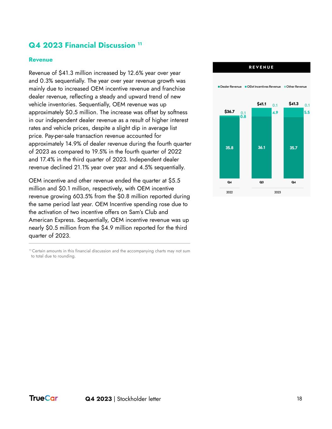 Q4 2023 | Stockholder letter 17 Fourth Quarter 2023 Financial Highlights Revenue: $41.3 million, up 12.6% year over year and up 0.3% sequentially from the third quarter of 2023. Net Loss: ($1.9) million, as compared to ($18.1) million in the fourth quarter of 2022. Adjusted EBITDA:8 $2.1 million, as compared to ($10.0) million in the fourth quarter of 2022 and $0.8 million in the third quarter of 2023. Financial Flexibility:9 Our balance sheet remained strong with cash and equivalents of approximately $137.0 million as of December 31, 2023, and no debt. Revenue $41.3 million vs. $36.7 million in Q4 2022 Traffic10 7.0 million vs. 7.4 million in Q4 2022 Net Loss ($1.9) million vs. ($18.1) million in Q4 2022 Dealers 11,500 vs. 12,072 in Q4 2022 Adj. EBITDA8 $2.1 million vs. ($10.0) million in Q4 2022 Units 77K vs. 77K in Q4 2022 Cash & Equivalents9 137.0 million vs. $175.5 million in Q4 2022 Monetization $537/unit vs. $475/unit in Q4 2022 8 Adjusted EBITDA is a non-GAAP financial measure. Refer to “Use of Non-GAAP Financial Measures,” below, for its definition and a reconciliation to net loss, the most comparable financial measure calculated and presented in accordance with GAAP. 9 On December 31, 2023, cash and cash equivalents included $1.9 million restricted cash that is used to collateralize a letter of credit to secure certain of our obligations under one of our office leases. 10 Traffic refers to Average Monthly Unique Visitors. FOURTH QUARTER 2023 METRICS