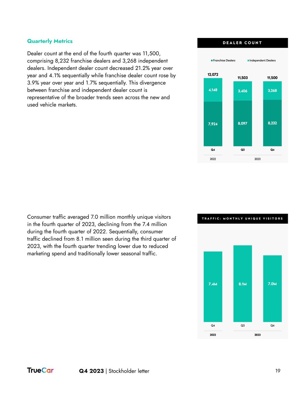 Q4 2023 | Stockholder letter Quarterly Metrics Dealer count at the end of the fourth quarter was 11,500, comprising 8,232 franchise dealers and 3,268 independent dealers. Independent dealer count decreased 21.2% year over year and 4.1% sequentially while franchise dealer count rose by 3.9% year over year and 1.7% sequentially. This divergence between franchise and independent dealer count is representative of the broader trends seen across the new and used vehicle markets. Consumer traffic averaged 7.0 million monthly unique visitors in the fourth quarter of 2023, declining from the 7.4 million during the fourth quarter of 2022. Sequentially, consumer traffic declined from 8.1 million seen during the third quarter of 2023, with the fourth quarter trending lower due to reduced marketing spend and traditionally lower seasonal traffic. 19