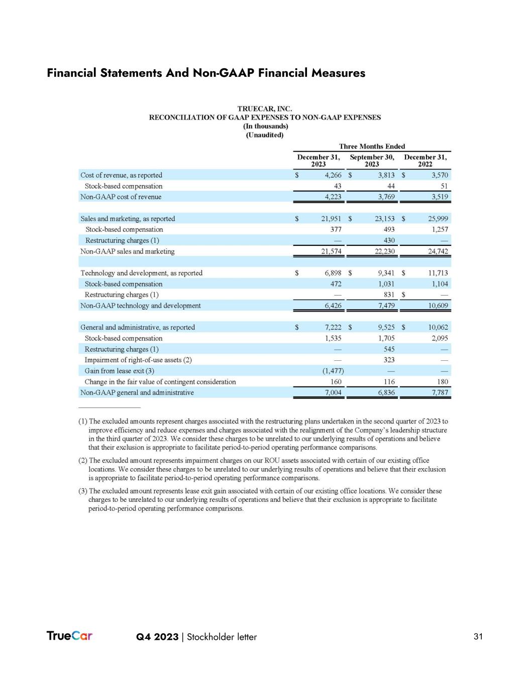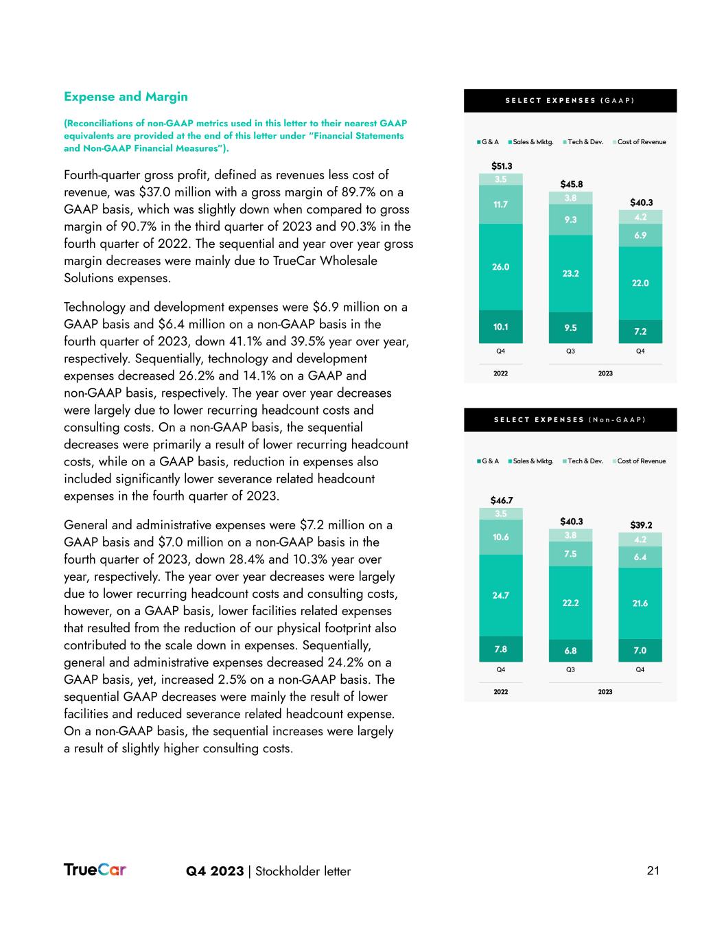 Q4 2023 | Stockholder letter 21 Expense and Margin (Reconciliations of non-GAAP metrics used in this letter to their nearest GAAP equivalents are provided at the end of this letter under “Financial Statements and Non-GAAP Financial Measures”). Fourth-quarter gross profit, defined as revenues less cost of revenue, was $37.0 million with a gross margin of 89.7% on a GAAP basis, which was slightly down when compared to gross margin of 90.7% in the third quarter of 2023 and 90.3% in the fourth quarter of 2022. The sequential and year over year gross margin decreases were mainly due to TrueCar Wholesale Solutions expenses. Technology and development expenses were $6.9 million on a GAAP basis and $6.4 million on a non-GAAP basis in the fourth quarter of 2023, down 41.1% and 39.5% year over year, respectively. Sequentially, technology and development expenses decreased 26.2% and 14.1% on a GAAP and non-GAAP basis, respectively. The year over year decreases were largely due to lower recurring headcount costs and consulting costs. On a non-GAAP basis, the sequential decreases were primarily a result of lower recurring headcount costs, while on a GAAP basis, reduction in expenses also included significantly lower severance related headcount expenses in the fourth quarter of 2023. General and administrative expenses were $7.2 million on a GAAP basis and $7.0 million on a non-GAAP basis in the fourth quarter of 2023, down 28.4% and 10.3% year over year, respectively. The year over year decreases were largely due to lower recurring headcount costs and consulting costs, however, on a GAAP basis, lower facilities related expenses that resulted from the reduction of our physical footprint also contributed to the scale down in expenses. Sequentially, general and administrative expenses decreased 24.2% on a GAAP basis, yet, increased 2.5% on a non-GAAP basis. The sequential GAAP decreases were mainly the result of lower facilities and reduced severance related headcount expense. On a non-GAAP basis, the sequential increases were largely a result of slightly higher consulting costs.
